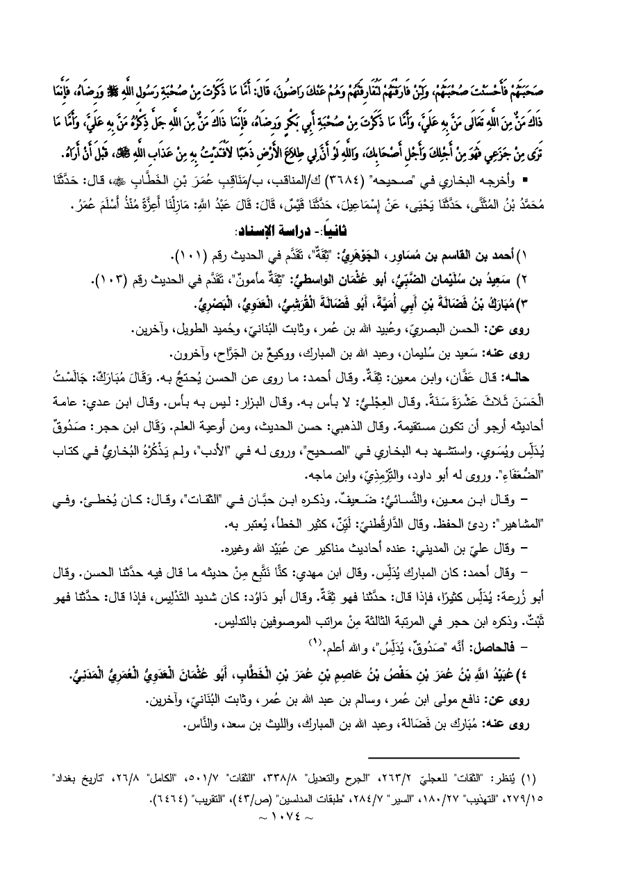 (¬١) يُنظر: "الثقات" للعجليّ ٢/ ٢٦٣، "الجرح والتعديل" ٨/ ٣٣٨، "الثقات" ٧/ ٥٠١، "الكامل" ٨/ ٢٦، "تاريخ بغداد" ١٥/ ٢٧٩، "التهذيب" ٢٧/ ١٨٠، "السير" ٧/ ٢٨٤، "طبقات المدلسين" (ص/٤٣)، "التقريب" (٦٤٦٤). وقد أطال د/ حاتم بن عارف العوني في ترجمته في كتابه: "المرسل الخفي وعلاقته بالتدليس" (ص/٣٤٢ - ٣٦٥)، وبَيَّن أنَّه: "صَدُوقٌ يُدَلِّس"، فلا بد أن يُصَرِّح بالسَّمَاع، إلا إذا روى عن الحسن البصري، فإذا عنعن عنه فحديثه حسَنٌ، وإذا صَرَّح بالسَّماع منه فحديثه صحيحٌ؛ لطول ملازمته للحسن البصري، فقد لازمه ثلاث عشرة سنة، ولم يصح وصفه بالتسويه، ولم يصفه بذلك إلا الحافظ ابن حجر.