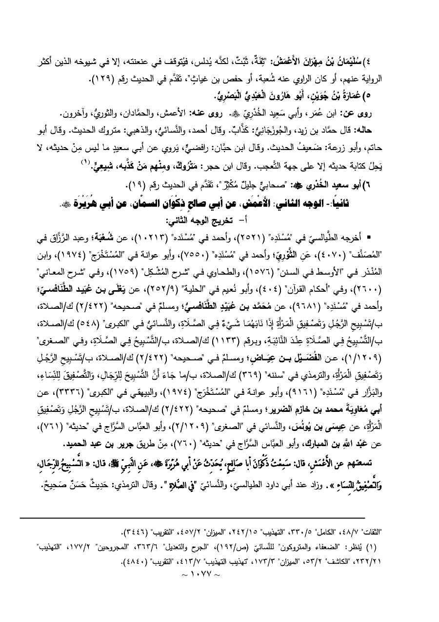 تسعتهم عن الأَعْمَشِ، قال: سَمِعْتُ ذَكْوَانَ أبا صَالِحٍ، يُحَدِّثُ عَنْ أبي هُرَيْرَةَ - رضي الله عنه -، عَنِ النَّبِيِّ - صلى الله عليه وسلم -، قال: «التَّسْبِيحُ لِلرِّجَالِ، وَالتَّصْفِيقُ لِلنِّسَاءِ». وزاد عند أبي داود الطيالسيّ، والنَّسائيّ "في الصَّلاةِ ". وقال الترمذي: حَدِيثٌ حَسَنٌ صَحِيحٌ.