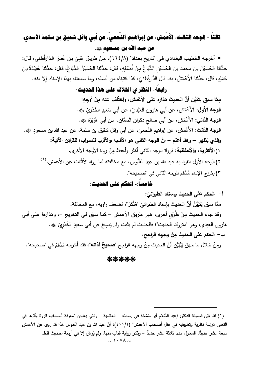 ٢) الوجه الأول انفرد به عبد الله بن عبد القُدُّوس، مع مخالفته لما رواه الأَثْبَات عن الأعمش. (¬١)