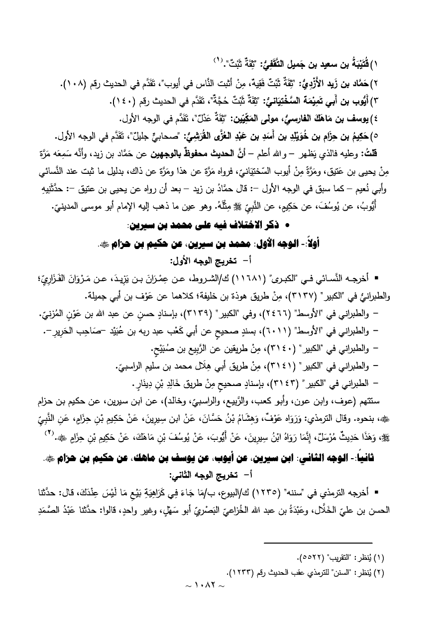 ستتهم (عوف، وابن عون، وأبو كعب، والرَّبيع، والراسبيّ، وخالد)، عن ابن سيرين، عن حكيم بن حزام - رضي الله عنه -، بنحوه. وقال الترمذي: وَرَوَاه عَوْفٌ، وَهِشَامُ بْنُ حَسَّانَ، عَنْ ابن سِيرِينَ، عَنْ حَكِيمِ بْنِ حِزَامٍ، عَنِ النَّبِيِّ - صلى الله عليه وسلم -، وَهَذَا حَدِيثٌ مُرْسَلٌ، إِنَّمَا رَوَاهُ ابْنُ سِيرِينَ، عَنْ أَيُّوبَ، عَنْ يُوسُفَ بْنِ مَاهَكَ، عَنْ حَكِيمِ بْنِ حِزَامٍ - رضي الله عنه -. (¬٢)