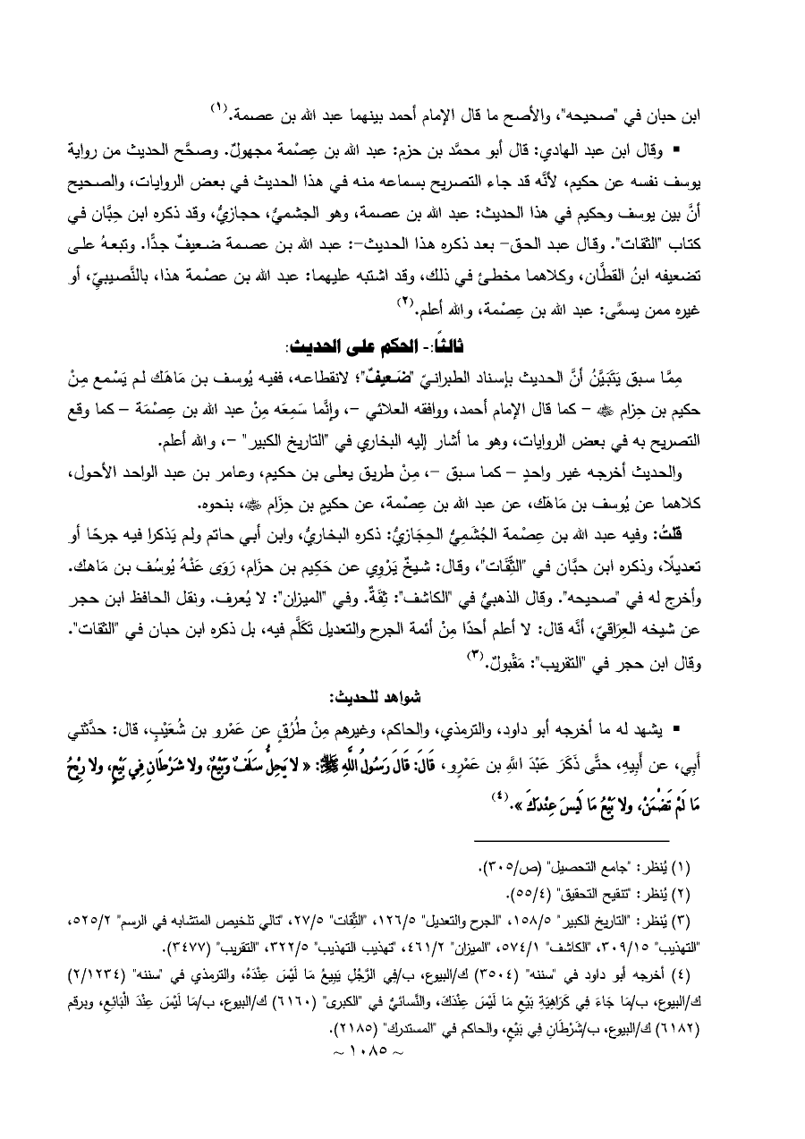 • وقال ابن عبد الهادي: قال أبو محمَّد بن حزم: عبد الله بن عِصْمة مجهولٌ. وصحَّح الحديث من رواية يوسف نفسه عن حكيم، لأنَّه قد جاء التصريح بسماعه منه في هذا الحديث في بعض الروايات، والصحيح أنَّ بين يوسف وحكيم في هذا الحديث: عبد الله بن عصمة، وهو الجشميُّ، حجازيُّ، وقد ذكره ابن حِبَّان في كتاب "الثقات". وقال عبد الحق - بعد ذكره هذا الحديث -: عبد الله بن عصمة ضعيفٌ جدًّا. وتبعهُ على تضعيفه ابنُ القطَّان، وكلاهما مخطئ في ذلك، وقد اشتبه عليهما: عبد الله بن عصْمة هذا، بالنَّصيبيِّ، أو غيره ممن يسمَّى: عبد الله بن عِصْمة، والله أعلم. (¬٢)