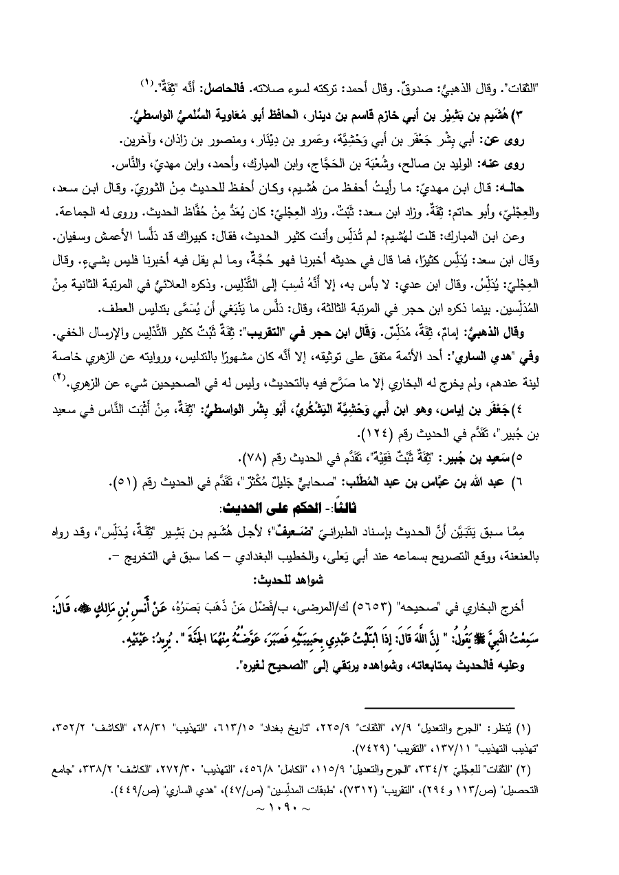 (¬٢) "الثقات" للعِجْليّ ٢/ ٣٣٤، "الجرح والتعديل" ٩/ ١١٥، "الكامل" ٨/ ٤٥٦، "التهذيب" ٣٠/ ٢٧٢، "الكاشف" ٢/ ٣٣٨، "جامع التحصيل" (ص/١١٣ و ٢٩٤)، "التقريب" (٧٣١٢)، "طبقات المدلِّسين" (ص/٤٧)، "هدي الساري" (ص/٤٤٩).