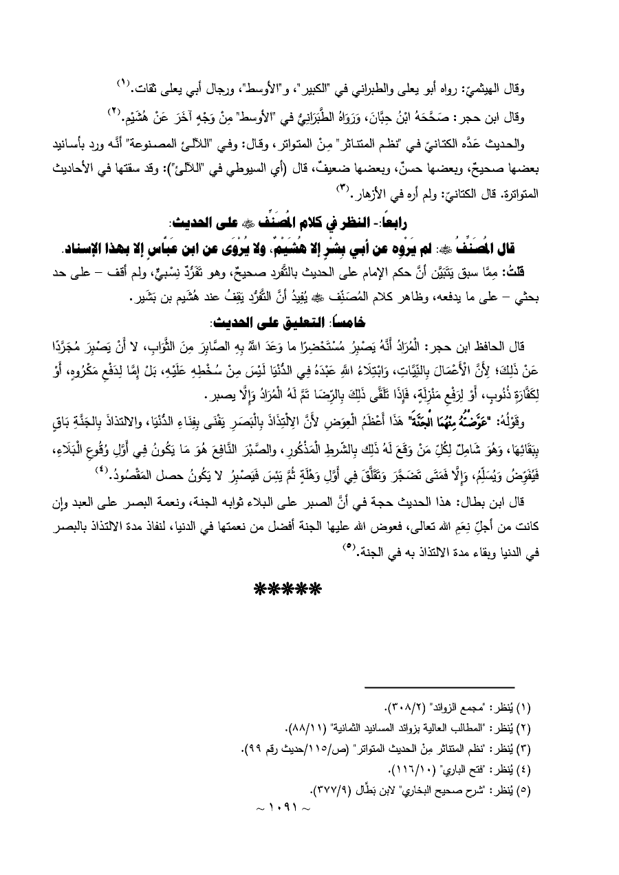 قال ابن بطال: هذا الحديث حجة في أنَّ الصبر على البلاء ثوابه الجنة، ونعمة البصر على العبد وإن كانت من أجلِّ نِعَمِ الله تعالى، فعوض الله عليها الجنة أفضل من نعمتها في الدنيا، لنفاذ مدة الالتذاذ بالبصر في الدنيا وبقاء مدة الالتذاذ به في الجنة. (¬٥)
