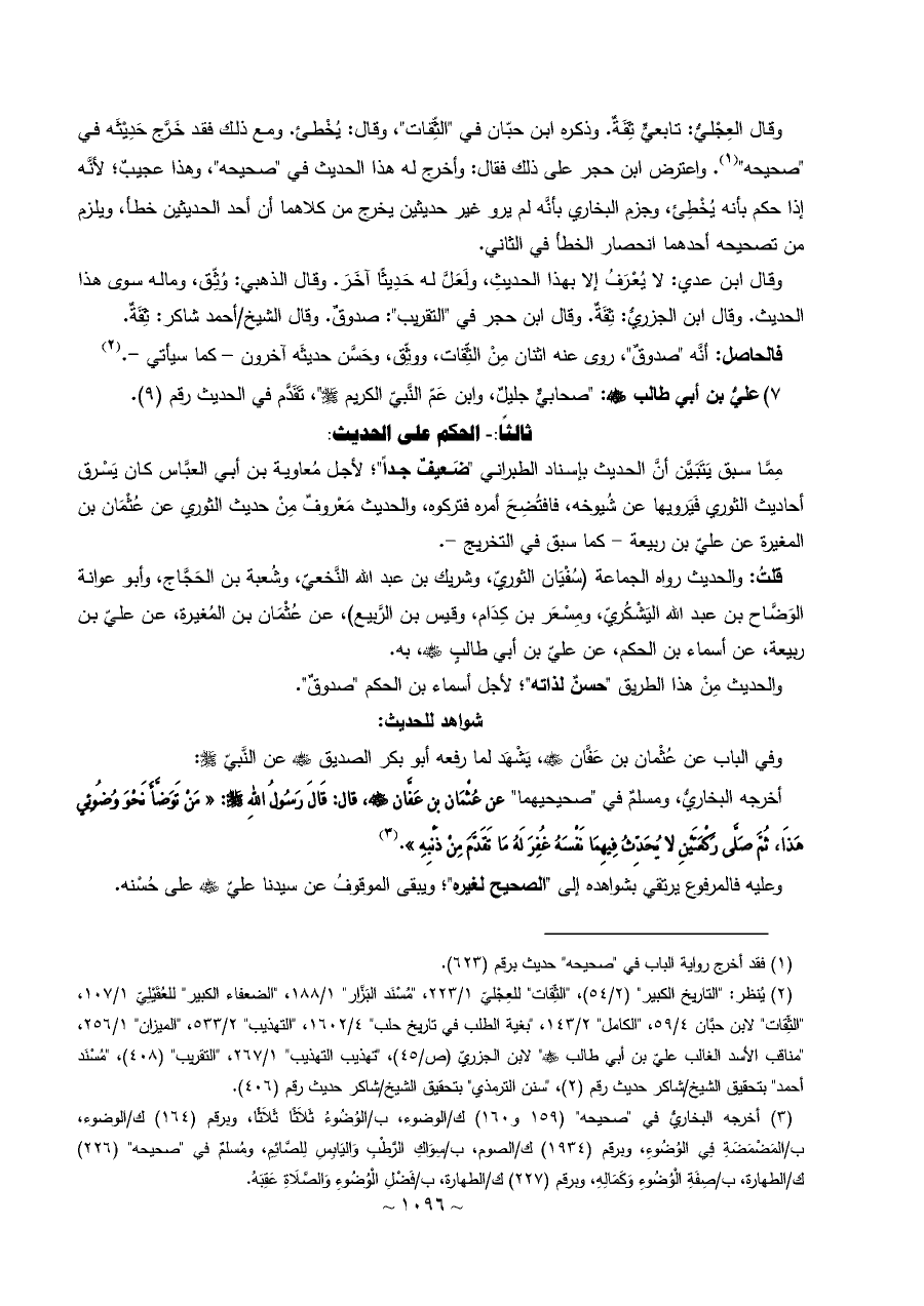 (¬٢) يُنظر: "التاريخ الكبير" (٢/ ٥٤)، "الثِّقات" للعِجْليّ ١/ ٢٢٣، "مُسْنَد البَزَّار" ١/ ١٨٨، "الضعفاء الكبير" للعُقَيْلِيّ ١/ ١٠٧، "الثِّقات" لابن حبَّان ٤/ ٥٩، "الكامل" ٢/ ١٤٣، "بغية الطلب في تاريخ حلب" ٤/ ١٦٠٢، "التهذيب" ٢/ ٥٣٣، "الميزان" ١/ ٢٥٦، "مناقب الأسد الغالب عليّ بن أبي طالب - رضي الله عنه - " لابن الجزريّ (ص/٤٥)، "تهذيب التهذيب" ١/ ٢٦٧، "التقريب" (٤٠٨)، "مُسْنَد أحمد" بتحقيق الشيخ/شاكر حديث رقم (٢)، "سنن الترمذي" بتحقيق الشيخ/شاكر حديث رقم (٤٠٦).