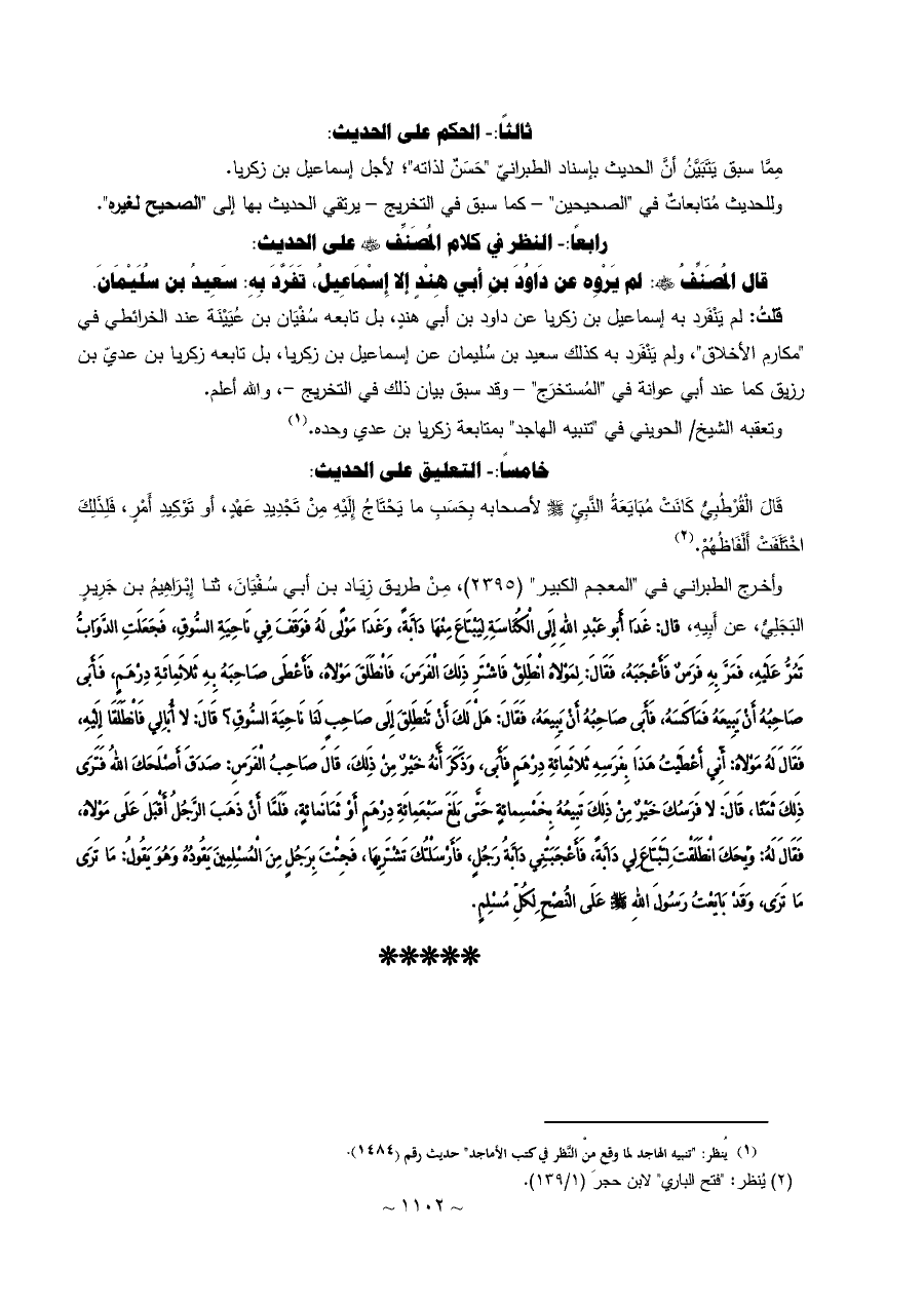 وتعقبه الشيخ/ الحويني في "تنبيه الهاجد" بمتابعة زكريا بن عدي وحده. (¬١)