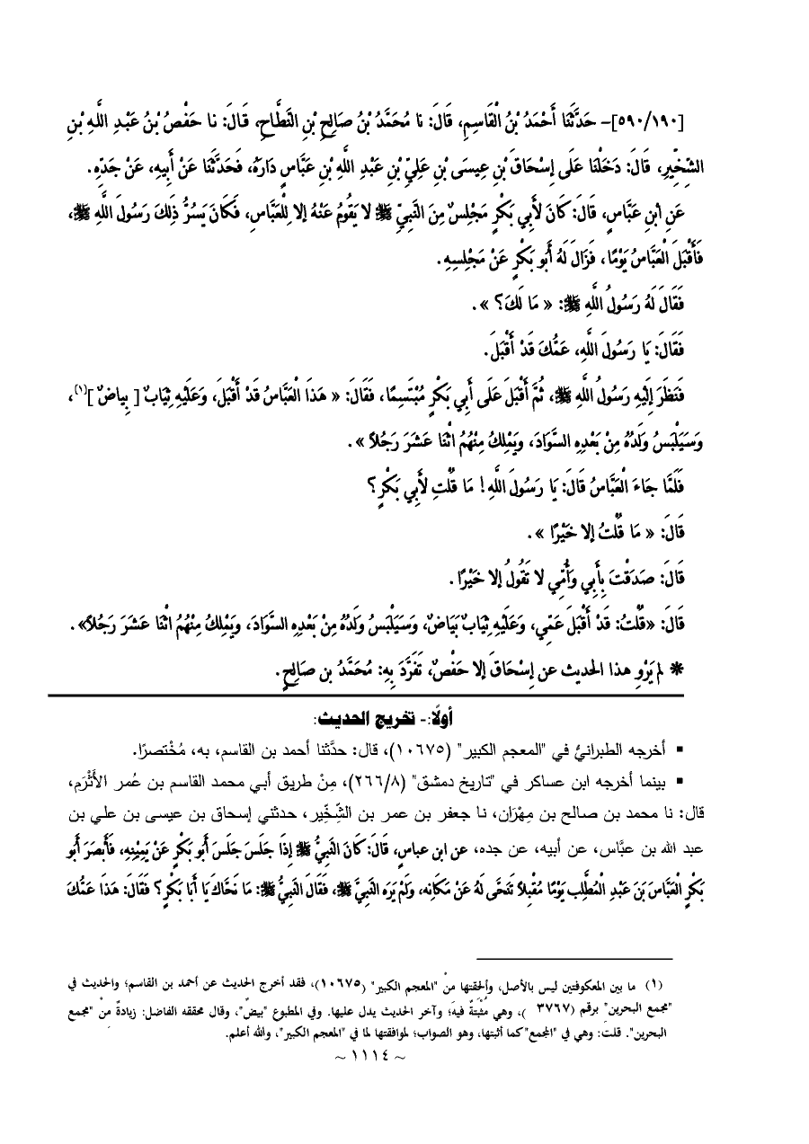 • بينما أخرجه ابن عساكر في "تاريخ دمشق" (٨/ ٢٦٦)، مِنْ طريق أبي محمد القاسم بن عُمر الأَثْرَم، قال: نا محمد بن صالح بن مِهْرَان، نا جعفر بن عمر بن الشِّخِّير، حدثني إسحاق بن عيسى بن علي بن عبد الله بن عبَّاس، عن أبيه، عن جده، عن ابن عباسٍ، قَالَ: كَانَ النَّبِيُّ - صلى الله عليه وسلم - إِذَا جَلَسَ جَلَسَ أَبُو بَكْرٍ عَنْ يَمِيْنِهِ، فَأَبْصَرَ أَبُو بَكْرٍ الْعَبَّاسَ بَنَ عَبْدِ الْمُطَّلِب يَوْمًا مُقْبِلاً تَنَحَّى لَهُ عَنْ مَكَانِه، وَلَمْ يَرَه النَّبِيَّ - صلى الله عليه وسلم -، فَقَالَ النَّبِيُّ - صلى الله عليه وسلم -: مَا نَحَّاكَ يَا أَبَا بَكْرٍ؟ فَقَالَ: هَذَا عَمُّكَ