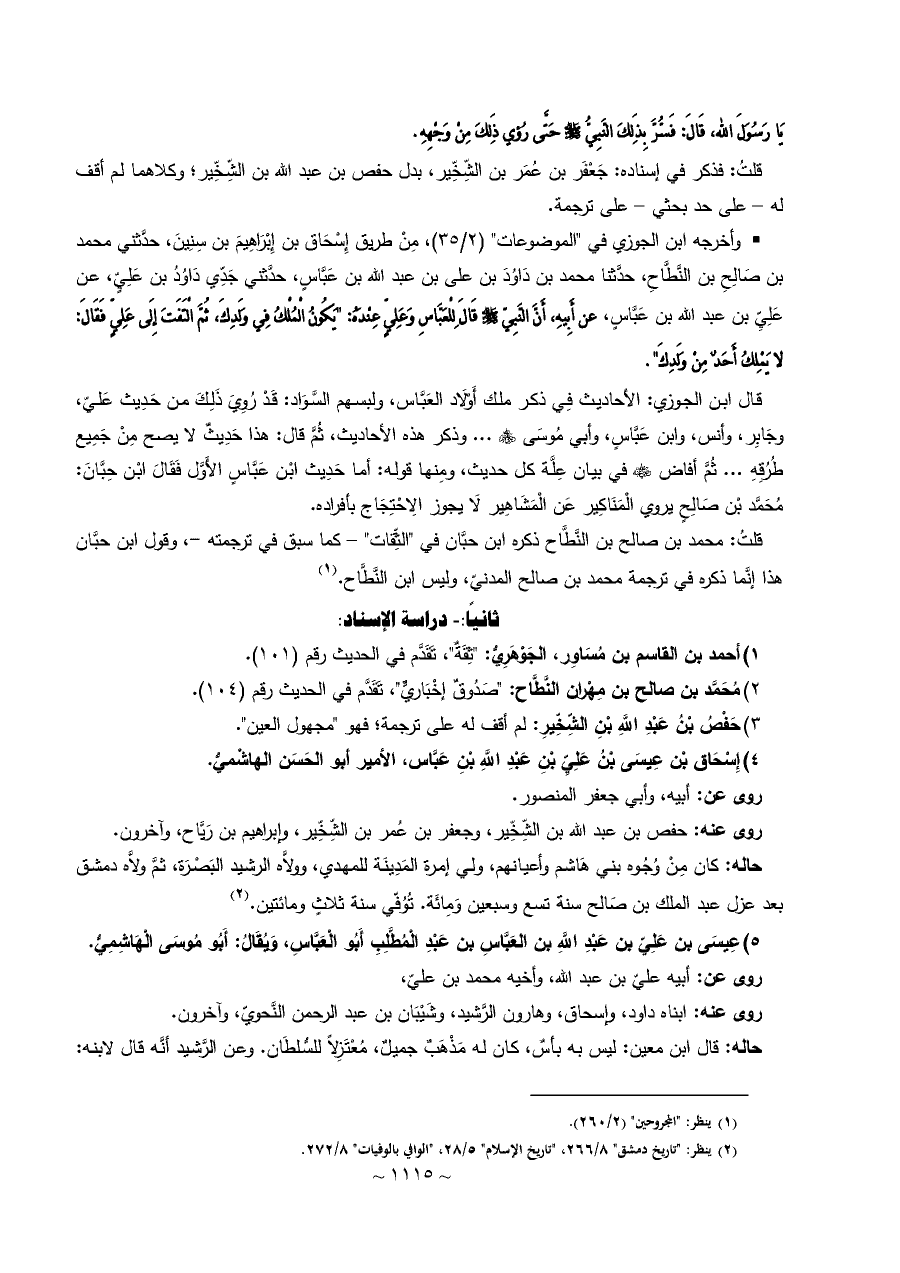 قال ابن الجوزي: الأحاديث فِي ذكر ملك أَوْلَاد العَبَّاس، ولبسهم السَّوَاد: قَدْ رُوِيَ ذَلِكَ من حَدِيث عَليّ، وجَابِر، وأنس، وابن عَبَّاسٍ، وأبي مُوسَى - رضي الله عنهم - ... وذكر هذه الأحاديث، ثُمَّ قال: هذا حَدِيثٌ لا يصح مِنْ جَمِيع طُرُقِهِ ... ثُمَّ أفاض - رضي الله عنه - في بيان عِلَّة كل حديث، ومِنها قوله: أما حَدِيث ابْن عَبَّاسٍ الأَوَّل فَقَالَ ابْن حِبَّانَ: مُحَمَّد بْن صَالِحٍ يروي الْمَنَاكِير عَن الْمَشَاهِير لَا يجوز الِاحْتِجَاج بأفراده.