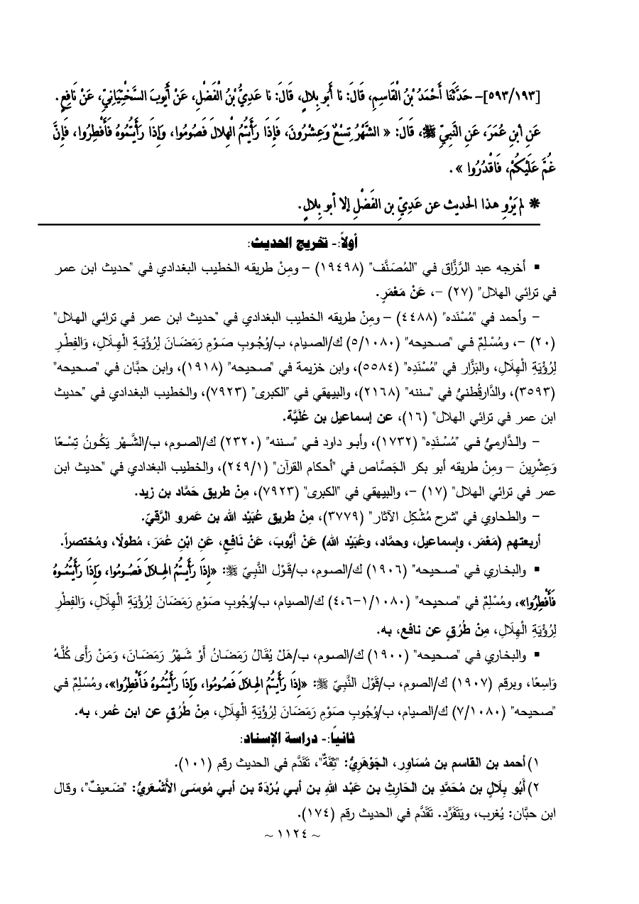 [١٩٣/ ٥٩٣]- حَدَّثَنَا أَحْمَدُ بْنُ الْقَاسِمِ، قَالَ: نا أَبُو بِلالٍ، قَالَ: نا عَدِيُّ بْنُ الْفَضْلِ، عَنْ أَيُّوبَ السَّخْتِيَانِيِّ، عَنْ نَافِعٍ.