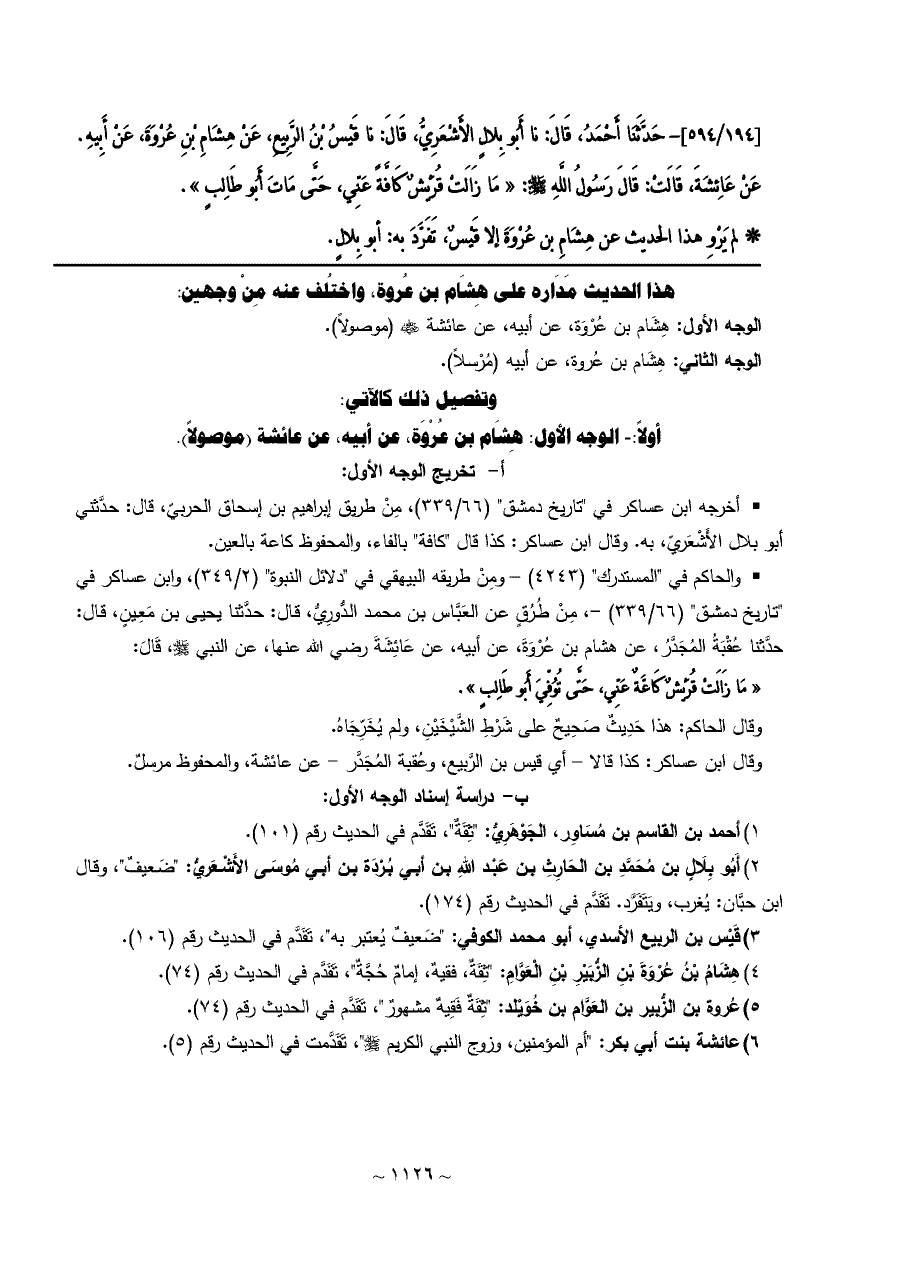 [١٩٤/ ٥٩٤]- حَدَّثَنَا أَحْمَدُ، قَالَ: نا أَبُو بِلالٍ الأَشْعَرِيُّ، قَالَ: نا قَيْسُ بْنُ الرَّبِيعِ، عَنْ هِشَامِ بْنِ عُرْوَةَ، عَنْ أَبِيهِ.