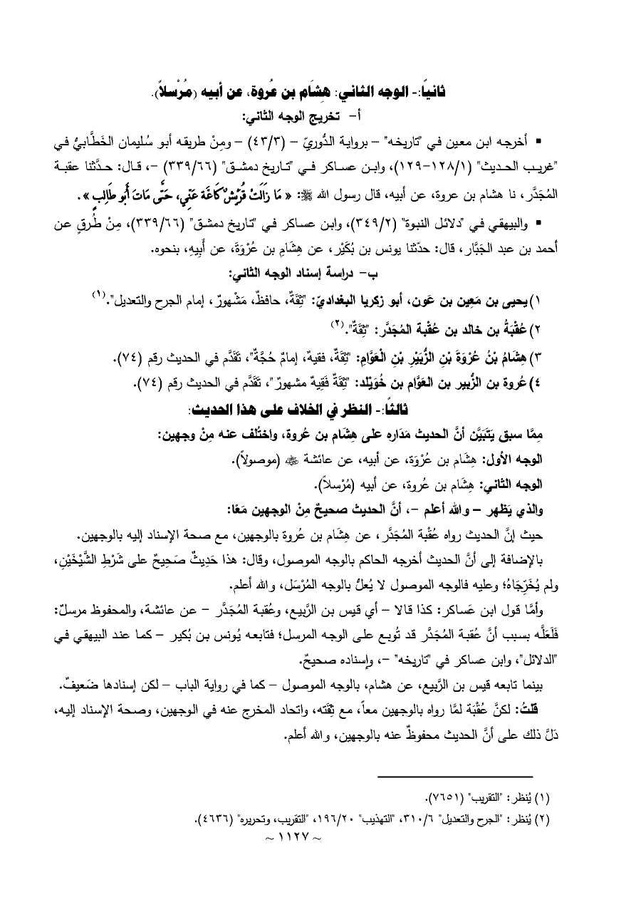 ٣) هِشَامُ بْنُ عُرْوَةَ بْنِ الزُّبَيْرِ بْنِ الْعَوَّامِ: "ثِقَةٌ، فقيهٌ، إمامٌ حُجَّةٌ"، تَقَدَّم في الحديث رقم (٧٤).
