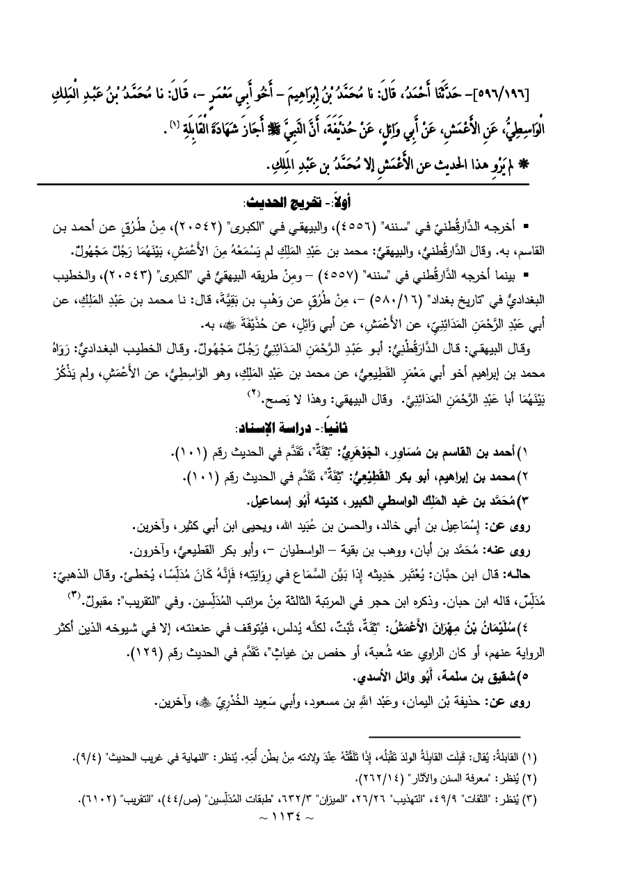 [١٩٦/ ٥٩٦]- حَدَّثَنَا أَحْمَدُ، قَالَ: نا مُحَمَّدُ بْنُ إِبْرَاهِيمَ - أَخُو أَبِي مَعْمَرٍ -، قَالَ: نا مُحَمَّدُ بْنُ عَبْدِ الْمَلِكِ الْوَاسِطِيُّ، عَنِ الأَعْمَشِ، عَنْ أَبِي وَائِلٍ، عَنْ حُذَيْفَةَ، أَنَّ النَّبِيَّ - صلى الله عليه وسلم - أَجَازَ شَهَادَةَ الْقَابِلَةِ (¬١).