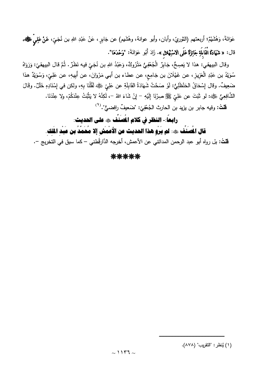 عَوَانَةَ, وَهُشَيْمٌ؛ أربعتهم (الثوريّ، وأبان، وأبو عوانة، وهُشَيم) عن جَابِرٍ, عَنْ عَبْدِ اللهِ بن نُجَيٍّ, عَنْ عَلِيٍّ - رضي الله عنه -، قال: «شَهَادَةُ الْقَابِلَةِ جَائِزَةٌ عَلَى الاسْتِهْلالِ». زَادَ أَبُو عَوَانَةَ: "وَحْدَهَا".