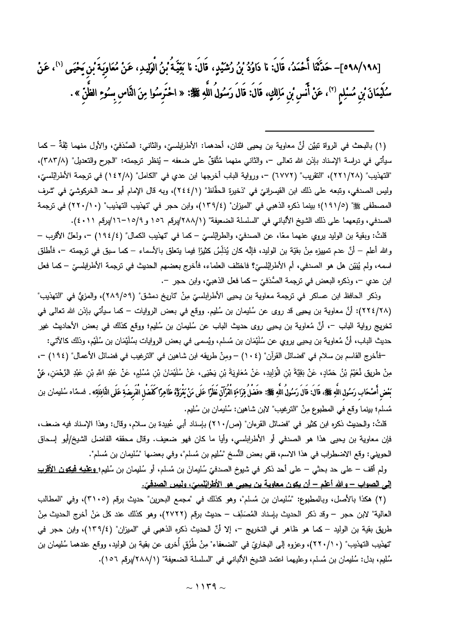 (¬١) بالبحث في الرواة تبيَّن أنَّ معاوية بن يحيى اثنان، أحدهما: الأطرابلسيّ، والثاني: الصَّدَفيّ، والأول منهما ثِقَةٌ - كما سيأتي في دراسة الإسناد بإذن الله تعالى -، والثاني منهما مُتَّفقٌ على ضعفه - يُنظر ترجمته: "الجرح والتعديل" (٨/ ٣٨٣)، "التهذيب" (٢٨/ ٢٢١)، "التقريب" (٦٧٧٢) -، ورواية الباب أخرجها ابن عدي في "الكامل" (٨/ ١٤٢) في ترجمة الأطرابُلسيّ، وليس الصدفي، وتبعه على ذلك ابن القيسرانيّ في "ذخيرة الحفَّاظ" (١/ ٢٤٤)، وبه قال الإمام أبو سعد الخركوشيّ في "شرف المصطفى - صلى الله عليه وسلم - " (٥/ ١٩١)؛ بينما ذكره الذهبي في "الميزان" (٤/ ١٣٩)، وابن حجر في "تهذيب التهذيب" (١٠/ ٢٢٠) في ترجمة الصدفي، وتبعهما على ذلك الشيخ الألباني في "السلسلة الضعيفة" (١/ ٢٨٨/برقم ١٥٦ و ٩/ ١٥ - ١٦/برقم ٤٠١١).