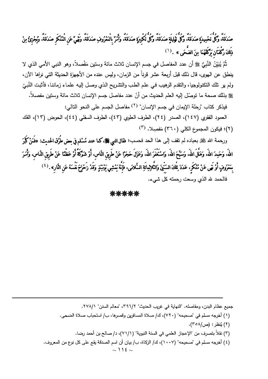 ثُمَّ يُبَيِّنُ النَّبِيُّ - صلى الله عليه وسلم - أن عدد المفاصل في جسم الإنسان ثلاث مائة وستين مَفْصلاً، وهو النبي الأمي الذي لا ينطق عن الهوى، قال ذلك قبل أربعة عشر قرناً من الزمان، وليس عنده من الأجهزة الحديثة التي نراها الآن، ولم ير تلك التكنولوجيا، والتقدم الرهيب في علم الطب والتشريح الذي وصل إليه علماء زماننا، فأثبت النَّبيّ - صلى الله عليه وسلم - بذلك صحة ما توصّل إليه العلم الحديث من أنّ عدد مفاصل جسم الإنسان ثلاث مائة وستين مفصلاّ.