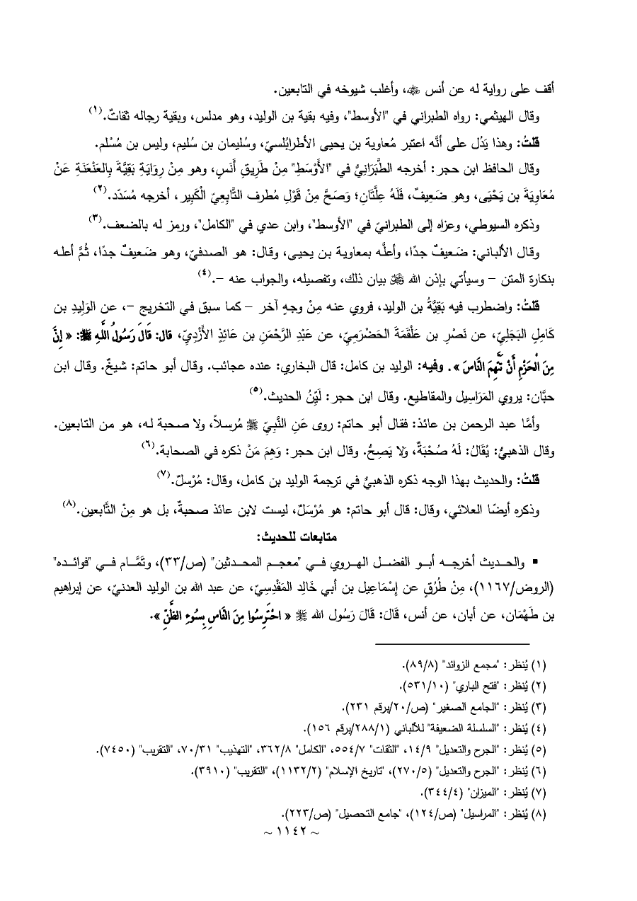 قلتُ: واضطرب فيه بَقِيَّةُ بن الوليد، فروي عنه مِنْ وجهٍ آخر - كما سبق في التخريج -، عن الوَلِيدِ بن كَامِلٍ البَجَلِيِّ، عن نَصْرِ بن عَلْقَمَةَ الحَضْرَمِيِّ، عن عَبْدِ الرَّحْمَنِ بن عَائِذٍ الأَزْدِيِّ، قال: قَالَ رَسُولُ اللَّهِ - صلى الله عليه وسلم -: «إِنَّ مِنَ الْحَزْمِ أَنْ تَتَّهِمَ النَّاسَ». وفيه: الوليد بن كامل: قال البخاري: عنده عجائب. وقال أبو حاتم: شيخٌ. وقال ابن حبَّان: يروي المَرَاسِيل والمقاطيع. وقال ابن حجر: لَيِّنُ الحديث. (¬٥)