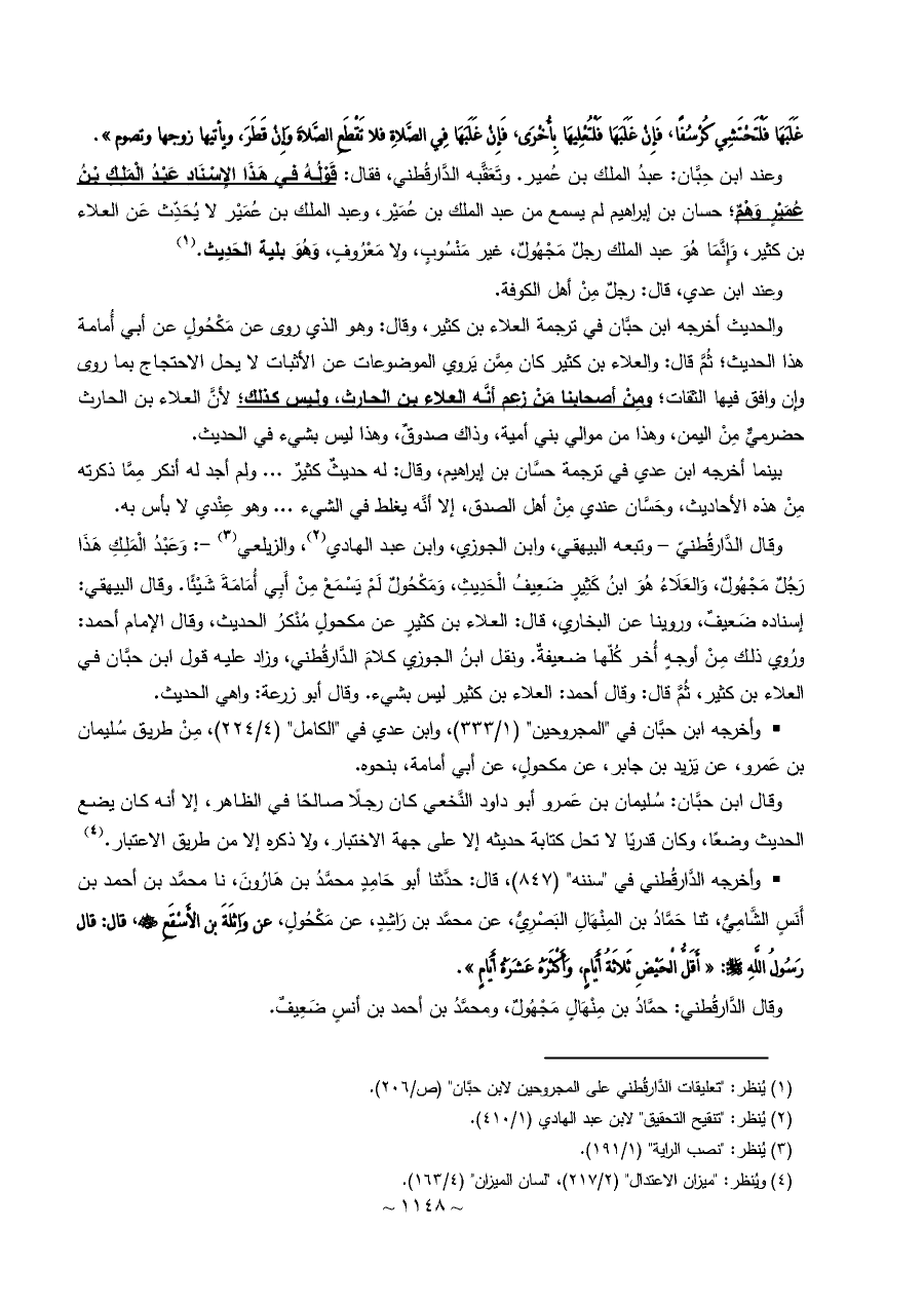 وعند ابن حِبَّان: عبدُ الملك بن عُمير. وتَعَقَّبه الدَّارقُطني، فقال: قَوْلُهُ في هَذَا الإِسْنَادِ عَبْدُ الْمَلِكِ بْنُ عُمَيْرٍ وَهْمٌ؛ حسان بن إبراهيم لم يسمع من عبد الملك بن عُمَيْر، وعبد الملك بن عُمَيْر لا يُحَدِّث عَن العلاء بن كثير، وَإِنَّمَا هُوَ عبد الملك رجلٌ مَجْهُولٌ، غير مَنْسُوبٍ، ولا مَعْرُوفٍ، وَهُوَ بلية الحَدِيث. (¬١)
