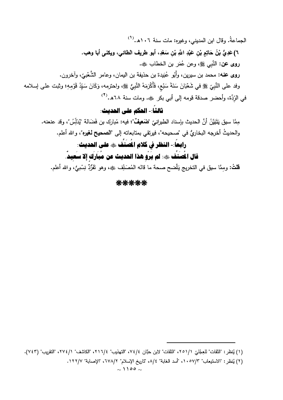 ٦) عَدِيُّ بْنُ حَاتِمٍ بْنِ عَبْدِ اللَّهِ بْنِ سَعْدِ، أبو طريف الطائي، ويكنى أبا وهب.