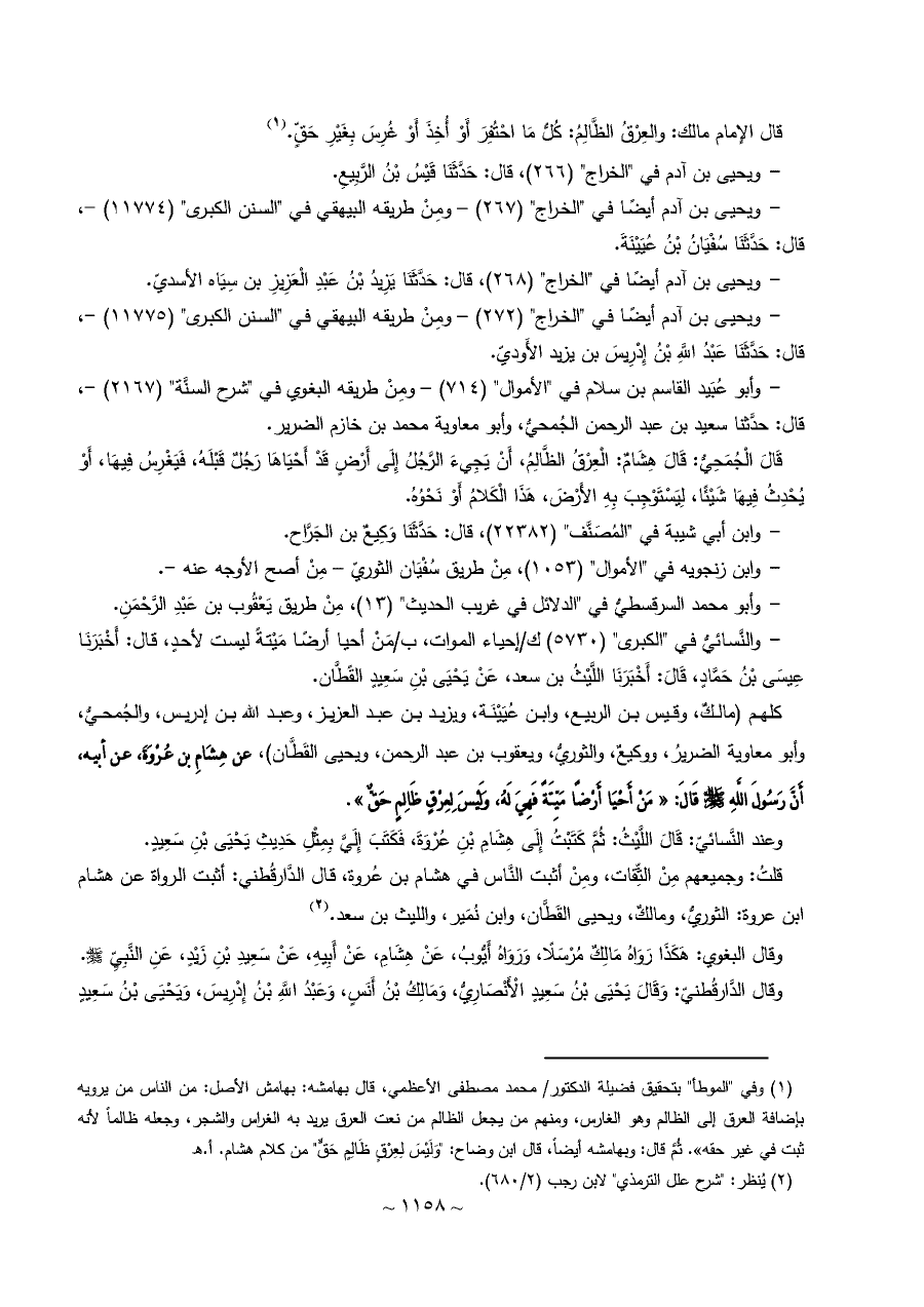 كلهم (مالكٌ، وقيس بن الربيع، وابن عُيَيْنَة، ويزيد بن عبد العزيز، وعبد الله بن إدريس، والجُمحيُّ، ... وأبو معاوية الضريرُ، ووكيعٌ، والثوريُّ، ويعقوب بن عبد الرحمن، ويحيى القَطَّان)، عن هِشَامِ بن عُرْوَةَ، عن أبيه، أَنَّ رَسُولَ اللَّهِ - صلى الله عليه وسلم - قَالَ: «مَنْ أَحْيَا أَرْضًا مَيِّتَةً فَهِيَ لَهُ، وَلَيْسَ لِعِرْقٍ ظَالِمٍ حَقٌّ».