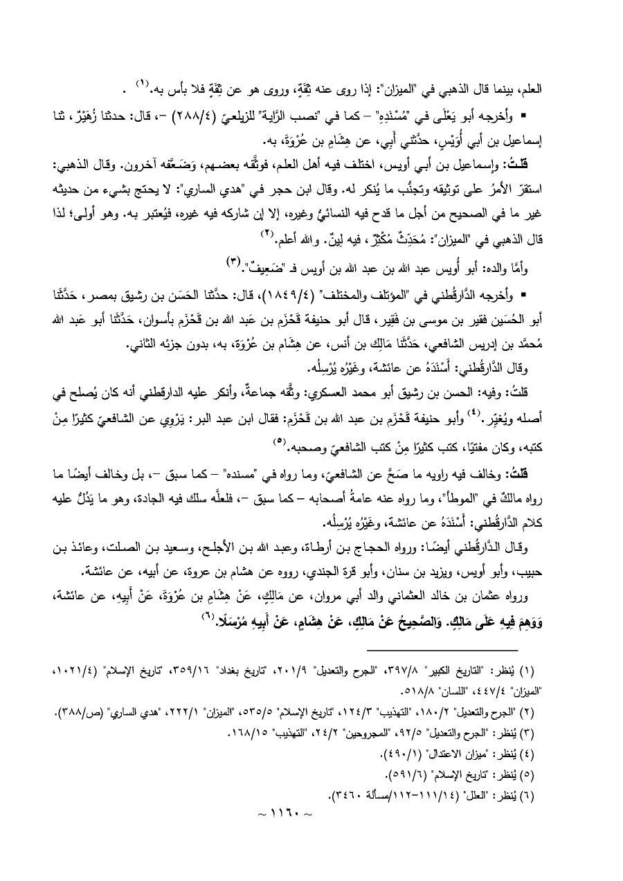 قلتُ: وإسماعيل بن أبي أويس، اختلف فيه أهل العلم، فوثَّقه بعضهم، وَضَعَّفه آخرون. وقال الذهبي: استقرّ الأمرُ على توثيقه وتجنُّب ما يُنكر له. وقال ابن حجر في "هدي الساري": لا يحتج بشيء من حديثه غير ما في الصحيح من أجل ما قدح فيه النسائيُّ وغيره، إلا إن شاركه فيه غيره، فيُعتبر به. وهو أولى؛ لذا قال الذهبي في "الميزان": مُحَدِّثٌ مُكْثِرٌ، فيه لِينٌ. والله أعلم. (¬٢)