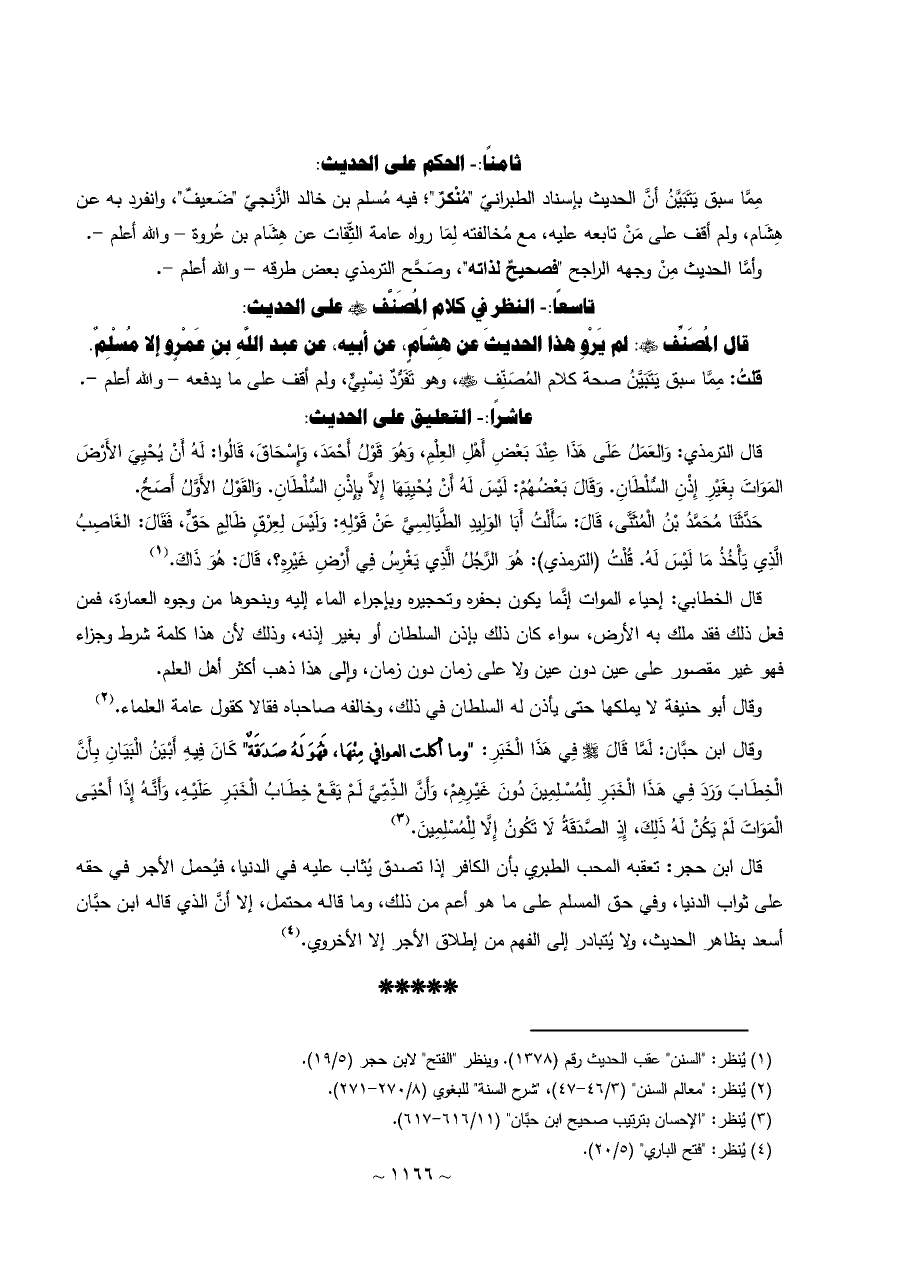 قال الترمذي: وَالعَمَلُ عَلَى هَذَا عِنْدَ بَعْضِ أَهْلِ العِلْمِ، وَهُوَ قَوْلُ أَحْمَدَ، وَإِسْحَاقَ، قَالُوا: لَهُ أَنْ يُحْيِيَ الأَرْضَ المَوَاتَ بِغَيْرِ إِذْنِ السُّلْطَانِ. وَقَالَ بَعْضُهُمْ: لَيْسَ لَهُ أَنْ يُحْيِيَهَا إِلَاّ بِإِذْنِ السُّلْطَانِ. وَالقَوْلُ الأَوَّلُ أَصَحُّ.