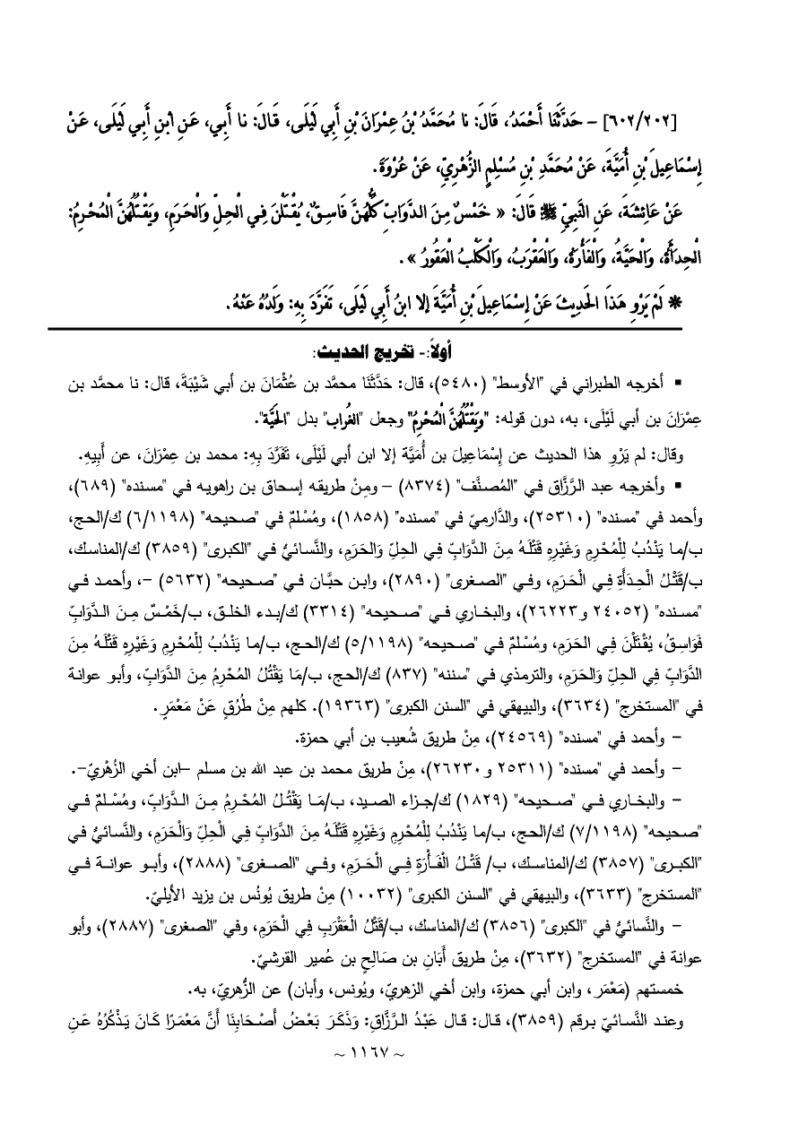 • أخرجه الطبراني في "الأوسط" (٥٤٨٠)، قال: حَدَّثَنَا محمَّد بن عُثْمَانَ بن أبي شَيْبَةَ، قال: نا محمَّد بن عِمْرَانَ بن أبي لَيْلَى، به، دون قوله: "ويَقْتُلُهُنَّ الْمُحْرِمُ" وجعل "الغُراب" بدل "الحَيَّة".