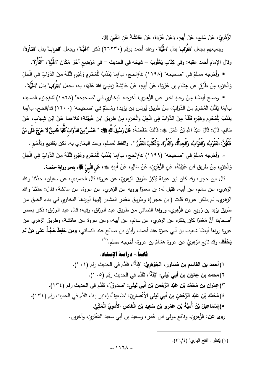 • وصح أيضًا مِنْ وجهٍ آخر عن الزُّهري: أخرجه البخاري في "صحيحه" (١٨٢٨) ك/جزاء الصيد، ب/مَا يَقْتُلُ المُحْرِمُ مِنَ الدَّوَابِّ، مِنْ طريق يُونس بن يزيد؛ ومُسلمٌ في "صحيحه" (١٢٠٠) ك/الحج، ب/ما يَنْدُبُ لِلْمُحْرِمِ وَغَيْرِهِ قَتْلَهُ مِنَ الدَّوَابِّ فِي الْحِلِّ وَالْحَرَمِ، مِنْ طريق ابن عُيَيْنَة؛ كلاهما عَنْ ابْنِ شِهَابٍ، عَنْ سَالِمٍ، قَالَ: قَالَ عَبْدُ اللَّهِ بْنُ عُمَرَ - رضي الله عنهم -: قَالَتْ حَفْصَةُ: قَالَ رَسُولُ اللَّهِ - صلى الله عليه وسلم -: " خَمْسٌ مِنَ الدَّوَابِّ كُلُّهَا فَاسِقٌ لا حَرَجَ عَلَى مَنْ قَتَلَهُنَّ: الْعَقْرَبُ، وَالْغُرَابُ، وَالْحِدَأَةُ، وَالْفَأْرَةُ، وَالْكَلْبُ الْعَقُورُ ". واللفظ لمسلم، وعند البخاري به، لكن بتقديمٍ وتأخيرٍ.