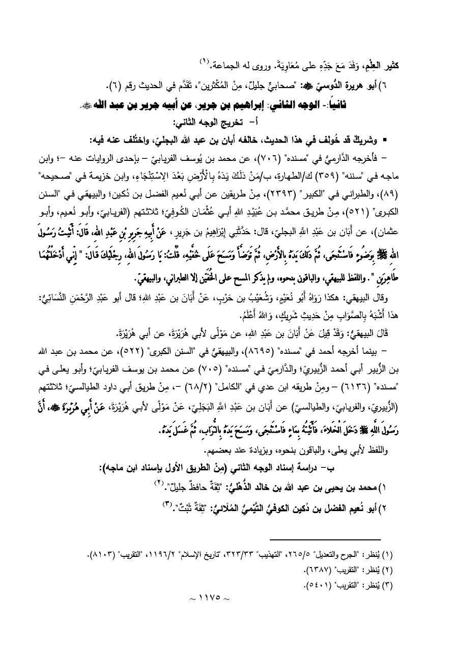 - فأخرجه الدَّارميُّ في "مسنده" (٧٠٦)، عن محمد بن يُوسف الفريابيّ - بإحدى الروايات عنه -؛ وابن ماجه في "سننه" (٣٥٩) ك/الطهارة، ب/مَنْ دَلَكَ يَدَهُ بِالْأَرْضِ بَعْدَ الِاسْتِنْجَاءِ، وابن خزيمة في "صحيحه" (٨٩)، والطبراني في "الكبير" (٢٣٩٣)، مِنْ طريقين عن أبي نُعيم الفضل بن دُكين؛ والبيهقي في "السنن الكبرى" (٥٢١)، مِنْ طريق محمَّد بن عُبَيْدِ اللهِ أبي عُثْمَان الكُوفِيّ؛ ثلاثتهم (الفريابيّ، وأبو نُعيم، وأبو عثمان)، عن أَبَان بن عَبْدِ اللَّهِ البجليّ، قال: حَدَّثَنِي إِبْرَاهِيمُ بن جَرِيرٍ، عَنْ أَبِيهِ جَرِيرِ بْنِ عَبْدِ اللهِ، قَالَ: أَتَيْتُ رَسُولَ اللهِ - صلى الله عليه وسلم - بِوَضُوءٍ فَاسْتَنْجَى، ثُمَّ دَلَكَ يَدَهُ بِالأَرْضِ، ثُمَّ تَوَضَّأَ وَمَسَحَ عَلَى خُفَّيْهِ، قُلْتُ: يَا رَسُولَ اللهِ، رِجْلَيْكَ قَالَ: " إِنِّي أَدْخَلْتُهُمَا طَاهِرَينِ ".واللفظ للبيهقي، والباقون بنحوه، ولم يذكر المسح على الخُفَيّن إلا الطبراني، والبيهقيّ.