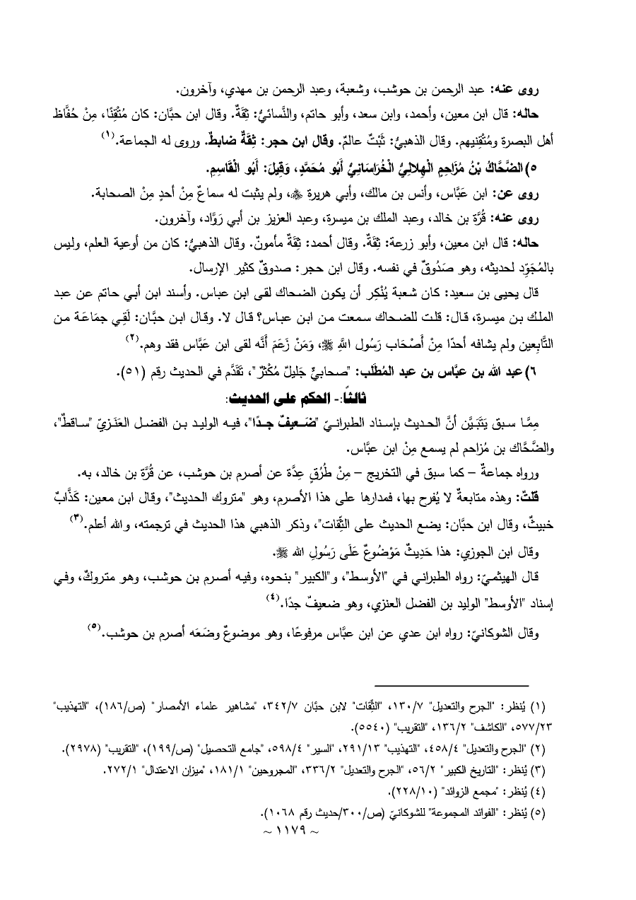 وقال الشوكانيّ: رواه ابن عدي عن ابن عبَّاس مرفوعًا، وهو موضوعٌ وضَعَه أصرم بن حوشب. (¬٥)