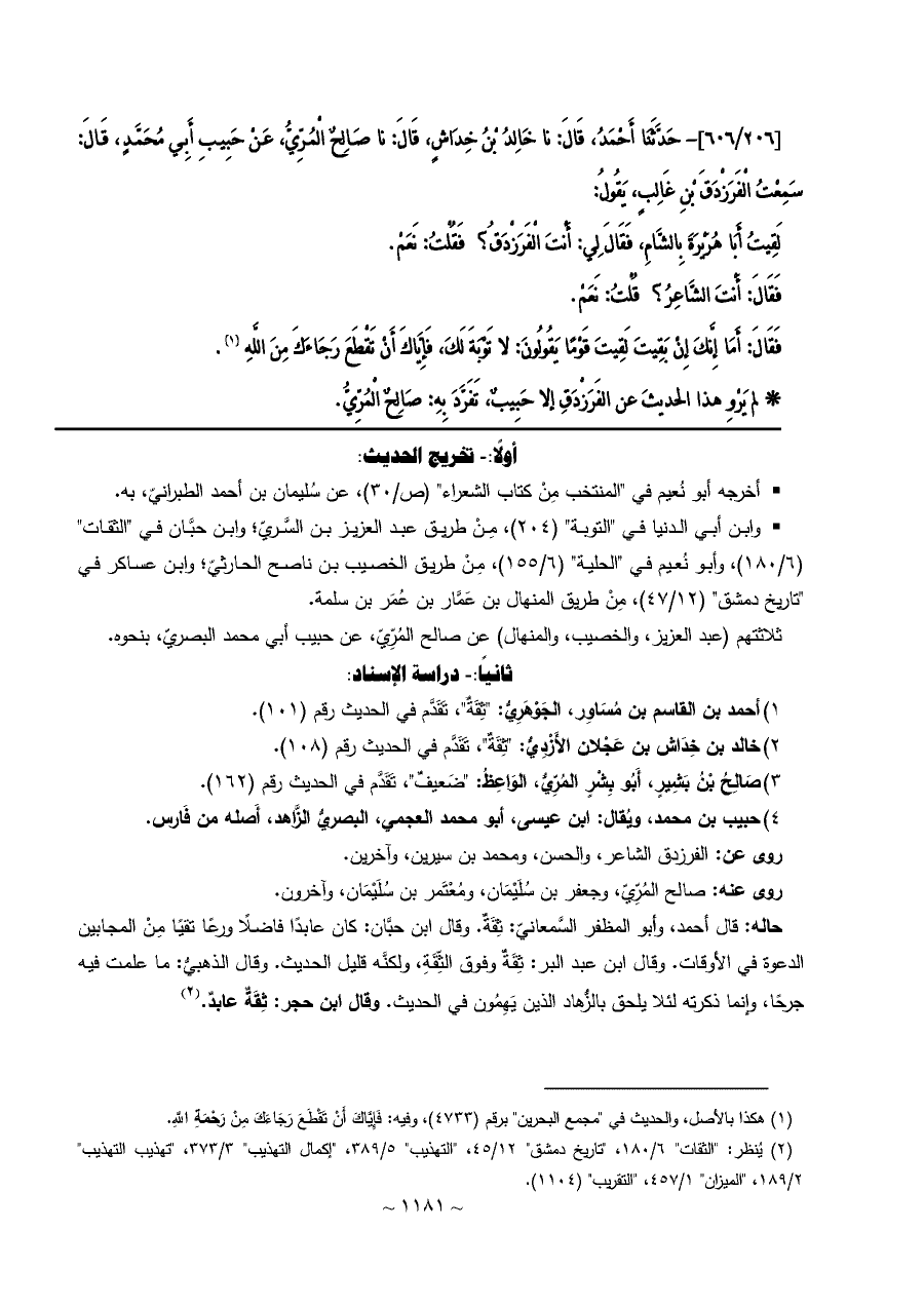 [٢٠٦/ ٦٠٦]- حَدَّثَنَا أَحْمَدُ، قَالَ: نا خَالِدُ بْنُ خِدَاشٍ، قَالَ: نا صَالِحٌ الْمُرِّيُّ، عَنْ حَبِيبِ أَبِي مُحَمَّدٍ، قَالَ: سَمِعْتُ الْفَرَزْدَقَ بْنِ غَالِبٍ، يَقُولُ:
