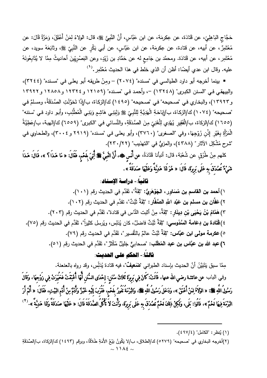 كلهم مِنْ طُرُقٍ عن شُعْبَة، قال: أنبأنا قَتَادَةُ، عن أَنَسٍ - رضي الله عنه -، أَنَّ النَّبِيَّ - صلى الله عليه وسلم - أُتِيَ بِلَحْمٍ، فَقَالَ: «مَا هَذَا؟»، قَالَ: هَذَا شَيْءٌ تُصُدِّقَ بِهِ عَلَى بَرِيرَةَ، قَالَ: «هُوَ لَنَا هَدِيَّةٌ وَعَلَيْهَا صَدَقَةٌ».