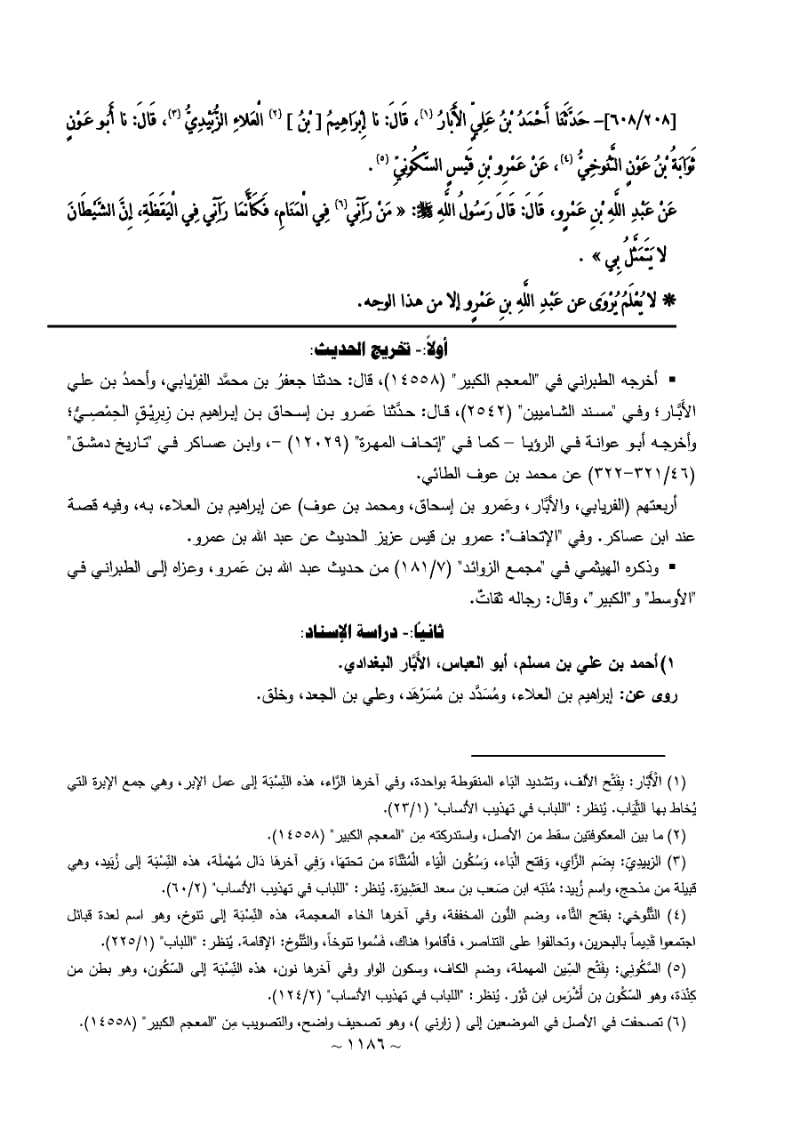 [٢٠٨/ ٦٠٨]- حَدَّثَنَا أَحْمَدُ بْنُ عَلِيٍّ الأَبَّارُ (¬١)، قَالَ: نا إِبْرَاهِيمُ [بْنُ] (¬٢) الْعَلاءِ الزُّبَيْدِيُّ (¬٣)، قَالَ: نا أَبُو عَوْنٍ ثَوَابَةُ بْنُ عَوْنٍ التَّنُوخِيُّ (¬٤)، عَنْ عَمْرِو بْنِ قَيْسٍ السَّكُونِيِّ (¬٥).