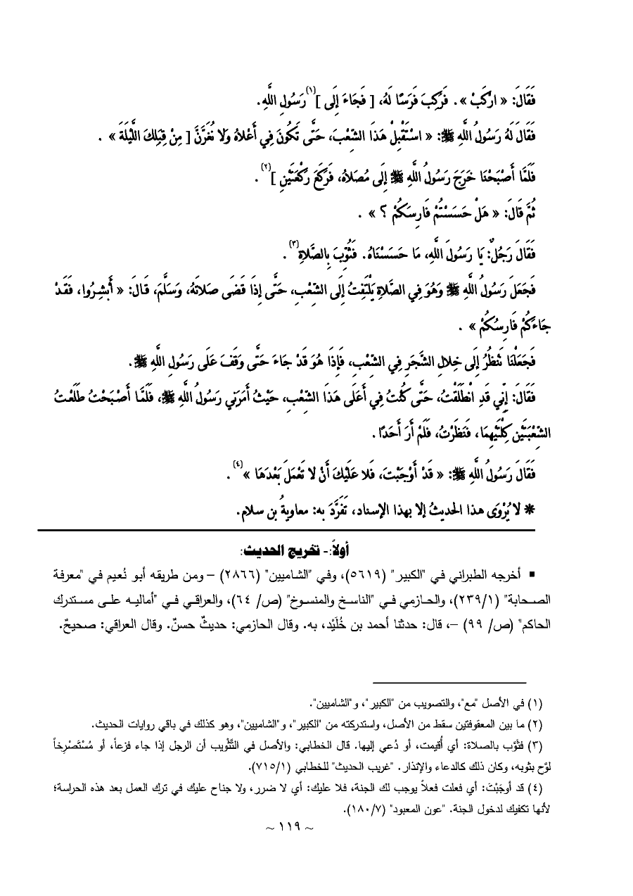 (¬٤) في الأصل: "فلا عليك أن تعمل بعدها"، وهو كذلك في "المعجم الكبير" برقم (٥٦١٩)، وفي "مسند الشاميين" برقم (٢٨٦٦)، والصواب ما أثبته، وهو موافق للمعنى، والتصويب من "معرفة الصحابة" لأبي نُعيم (١/ ٢٣٩/برقم ٨٣١)، فقد روى الحديث عن الإمام الطبراني، عن أحمد بن خليد، بسنده، وهي فيه كما أثبته، لكنه قال: " فَلَا عَلَيْكَ أَنْ لَا تَعْمَلَ غَيْرَهَا"، والحديث أخرجه أبو داود في "سننه" (٣/ ٩/برقم ٢٥٠١)، والنسائي في "السنن الكبرى" (٨/ ١٤٠/برقم ٨٨١٩)، والحاكم في "المستدرك" (٢/ ٩٣/برقم ٢٤٣٣)، كلهم من طرق عن أبي توبة، بسنده، كما أثبته، والله أعلم.