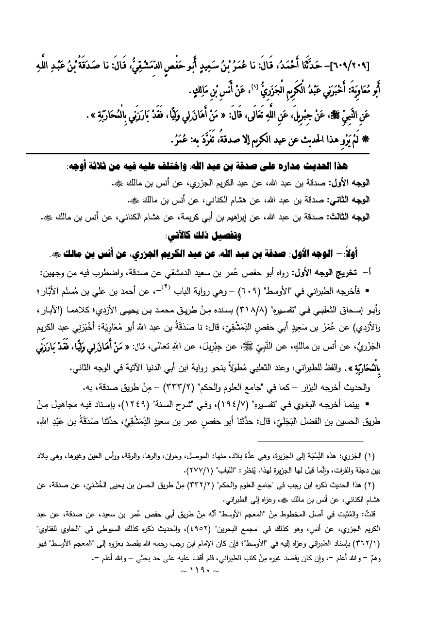 -، عن أحمد بن علي بن مُسلم الأبَّار؛ وأبو إسحاق الثعلبي في "تفسيره" (٨/ ٣١٨) بسنده مِنْ طريق محمد بن يحيى الأزدي؛ كلاهما (الآبار، والأزدي) عن عُمَرُ بن سَعِيدٍ أبي حفصٍ الدِّمَشْقِيّ، قال: نا صَدَقَةُ بن عبد اللَّه أبو مُعَاوِيَة: أخْبَرَنِي عبد الكريم الجَزَريُّ، عن أنس بن مالكٍ، عن النَّبِيِّ - صلى الله عليه وسلم -، عن جِبْرِيلَ، عن اللَّهِ تعالى، قال: «مَنْ أَهَانَ لِي وَلِيًّا، فَقَدْ بَارَزَنِي بِالْمُحَارَبَةِ». والفظ للطبراني، وعند الثعلبي مُطولاً بنحو رواية ابن أبي الدنيا الآتية في الوجه الثاني.