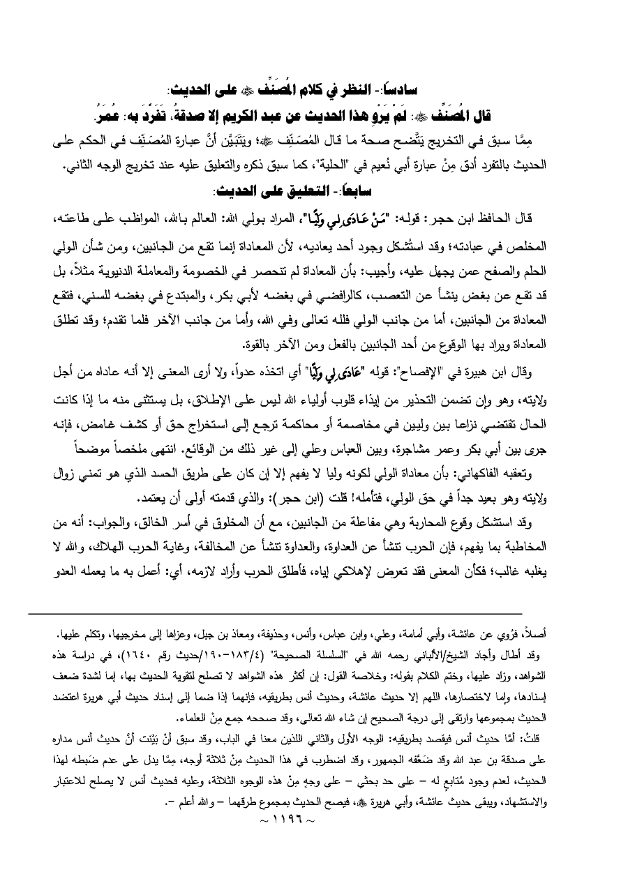 وقال ابن هبيرة في "الإفصاح": قوله "عَادَى لِي وَلِيًّا" أي اتخذه عدواً، ولا أرى المعنى إلا أنه عاداه من أجل ولايته، وهو وإن تضمن التحذير من إيذاء قلوب أولياء الله ليس على الإطلاق، بل يستثنى منه ما إذا كانت الحال تقتضي نزاعا بين وليين في مخاصمة أو محاكمة ترجع إلى استخراج حق أو كشف غامض، فإنه جرى بين أبي بكر وعمر مشاجرة، وبين العباس وعلي إلى غير ذلك من الوقائع. انتهى ملخصاً موضحاً