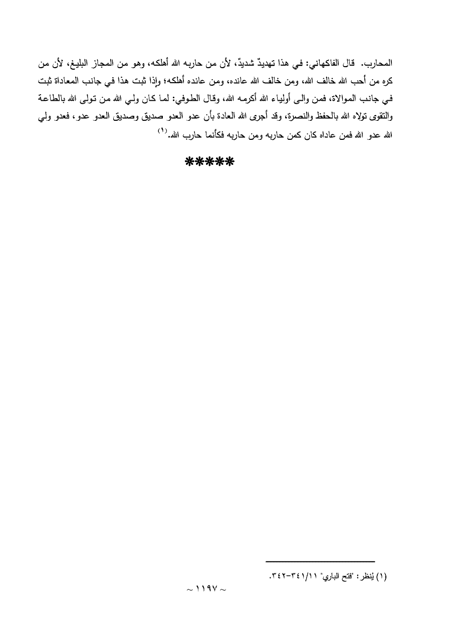 المحارب. قال الفاكهاني: في هذا تهديدٌ شديدٌ، لأن من حاربه الله أهلكه، وهو من المجاز البليغ، لأن من كره من أحب الله خالف الله، ومن خالف الله عانده، ومن عانده أهلكه؛ وإذا ثبت هذا في جانب المعاداة ثبت في جانب الموالاة، فمن والى أولياء الله أكرمه الله، وقال الطوفي: لما كان ولي الله من تولى الله بالطاعة والتقوى تولاه الله بالحفظ والنصرة، وقد أجرى الله العادة بأن عدو العدو صديق وصديق العدو عدو، فعدو ولي الله عدو الله فمن عاداه كان كمن حاربه ومن حاربه فكأنما حارب الله. (¬١)