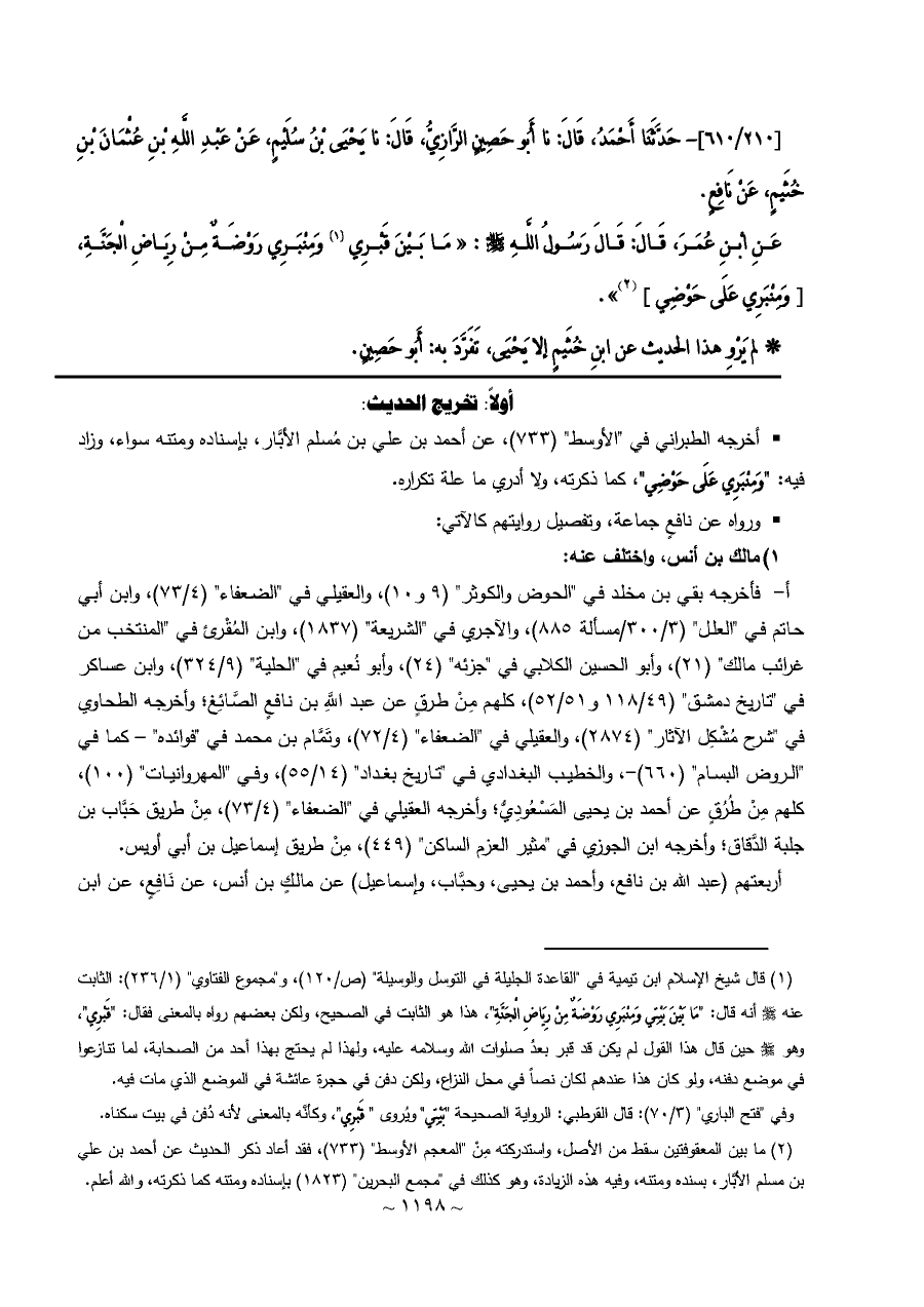 (¬١) قال شيخ الإسلام ابن تيمية في "القاعدة الجليلة في التوسل والوسيلة" (ص/١٢٠)، و"مجموع الفتاوي" (١/ ٢٣٦): الثابت عنه - صلى الله عليه وسلم - أنه قال: "مَا بَيْنَ بَيْتِي وَمِنْبَرِي رَوْضَةٌ مِنْ رِيَاضِ الْجَنَّةِ"، هذا هو الثابت في الصحيح، ولكن بعضهم رواه بالمعنى فقال: "قَبْرِي"، وهو - صلى الله عليه وسلم - حين قال هذا القول لم يكن قد قبر بعدُ صلوات الله وسلامه عليه، ولهذا لم يحتج بهذا أحد من الصحابة، لما تنازعوا في موضع دفنه، ولو كان هذا عندهم لكان نصاً في محل النزاع، ولكن دفن في حجرة عائشة في الموضع الذي مات فيه.