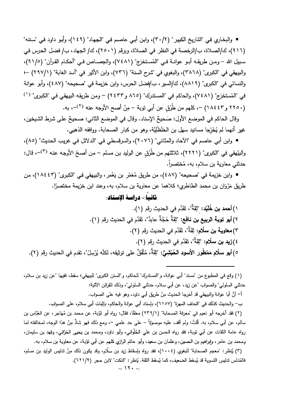 • والبخاري في "التاريخ الكبير" (٢/ ٣٠)، وابن أبي عاصم في "الجهاد" (١٤٩)، وأبو داود في "سننه" (٩١٦)، ك/الصلاة، ب/الرخصة في النظر في الصلاة، وبرقم (٢٥٠١)، ك/ الجهاد، ب/ فضل الحرس في سبيل الله - ومن طريقه أبو عوانة في "المُستخرَج" (٧٤٨١)، والجصاص في "أحكام القرآن" (٥/ ٩١)، والبيهقي في "الكبرى" (٣٨٦٨)، والبغوي في "شرح السنة" (٧٣٦)، وابن الأثير في "أسد الغابة" (١/ ٢٩٧) -؛ والنسائي في "الكبرى" (٨٨١٩)، ك/السير، ب/فضل الحرس، وابن خزيمة في "صحيحه" (٤٨٧)، وأبو عوانة في "المُستخرَج" (٧٤٨١)، والحاكم في "المستدرك" (٨٦٥ و ٢٤٣٣) - ومن طريقه البيهقي في "الكبرى" (¬١) (٢٢٥٠ و ١٨٤٤٣) -، كلهم من طُرُقٍ عن أبي توبة - مِنْ أصح الأوجه عنه (¬٢) -، به.