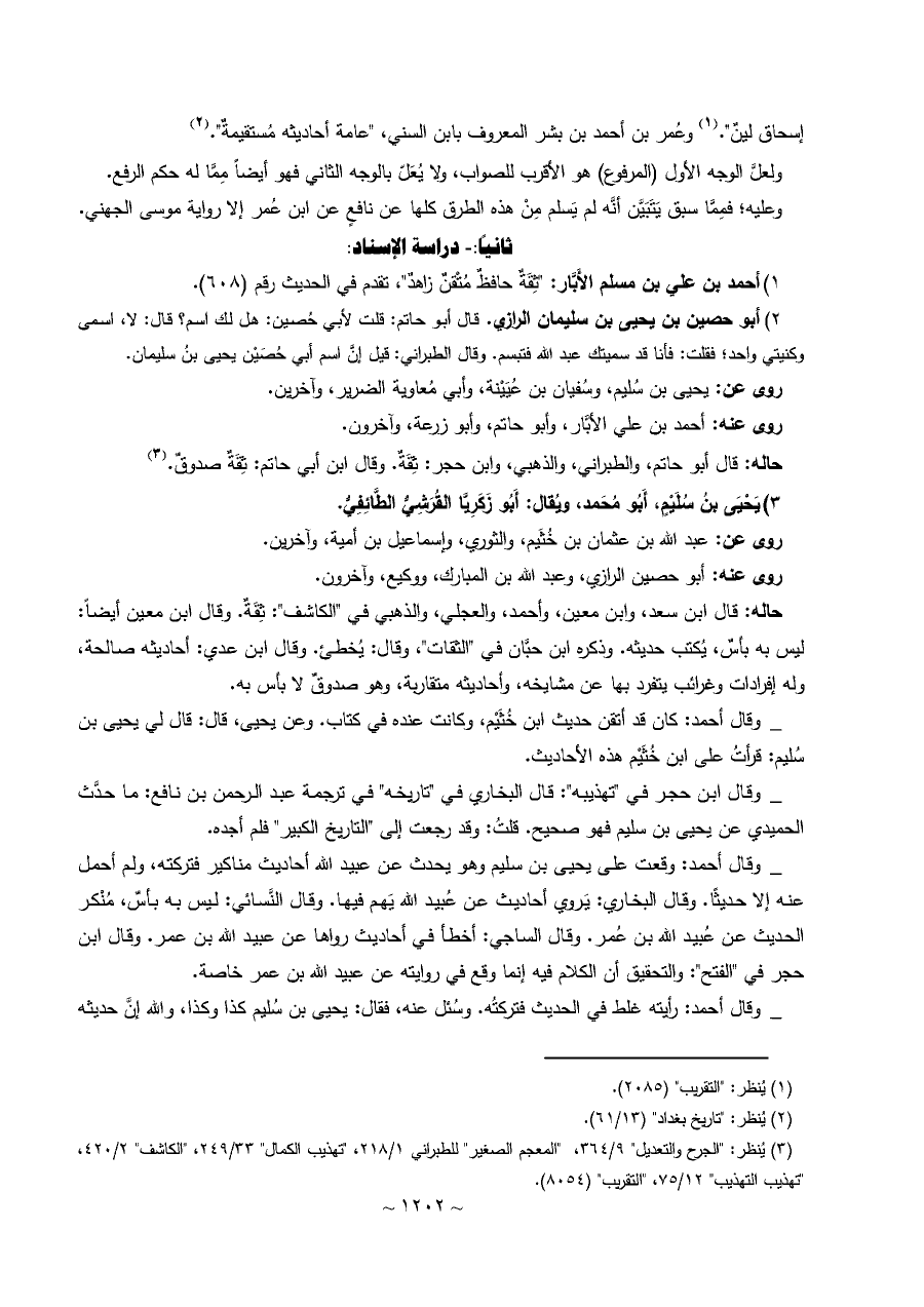 حاله: قال أبو حاتم، والطبراني، والذهبي، وابن حجر: ثِقَةٌ. وقال ابن أبي حاتم: ثِقَةٌ صدوقٌ. (¬٣)