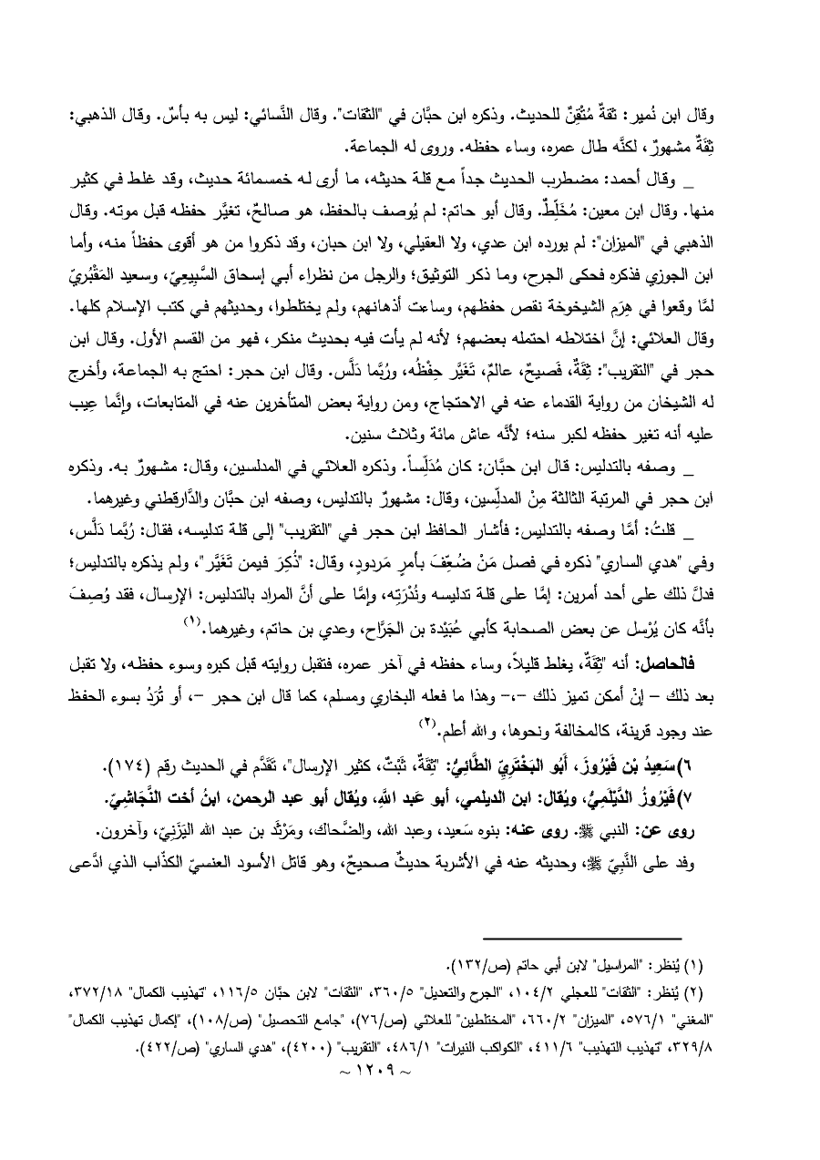 (¬٢) يُنظر: "الثقات" للعجلي ٢/ ١٠٤، "الجرح والتعديل" ٥/ ٣٦٠، "الثقات" لابن حبَّان ٥/ ١١٦، "تهذيب الكمال" ١٨/ ٣٧٢، "المغني" ١/ ٥٧٦، "الميزان" ٢/ ٦٦٠، "المختلطين" للعلائي (ص/٧٦)، "جامع التحصيل" (ص/١٠٨)، "إكمال تهذيب الكمال" ٨/ ٣٢٩، "تهذيب التهذيب" ٦/ ٤١١، "الكواكب النيرات" ١/ ٤٨٦، "التقريب" (٤٢٠٠)، "هدي الساري" (ص/٤٢٢).