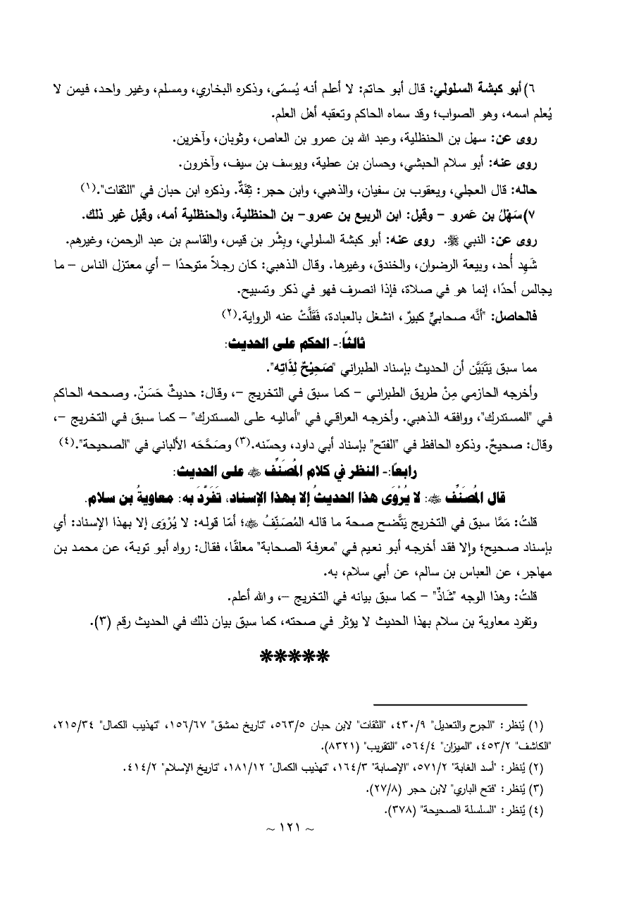 ٦) أبو كبشة السلولي: قال أبو حاتم: لا أعلم أنه يُسمّى، وذكره البخاري، ومسلم، وغير واحد، فيمن لا يُعلم اسمه، وهو الصواب؛ وقد سماه الحاكم وتعقبه أهل العلم.
