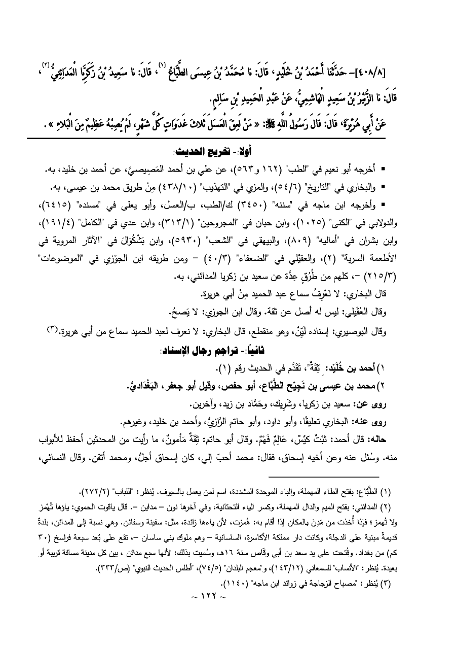 [٨/ ٤٠٨]- حَدَّثَنَا أَحْمَدُ بْنُ خُلَيْدٍ، قَالَ: نا مُحَمَّدُ بْنُ عِيسَى الطَّبَّاعُ (¬١)، قَالَ: نا سَعِيدُ بْنُ زَكَرِيَّا الْمَدَائِنِيُّ (¬٢)، قَالَ: نا الزُّبَيْرُ بْنُ سَعِيدٍ الْهَاشِمِيُّ، عَنْ عَبْدِ الْحَمِيدِ بْنِ سَالِمٍ.