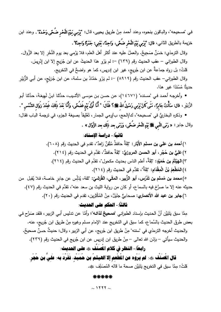 • وذكره البخاريُّ في "صحيحه"، ك/الحج، ب/رمي الجمار، تَعْلِيقاً بصيغة الجزم، في ترجمة الباب فقال: وقال جابر: «رَمَى النَّبِي - صلى الله عليه وسلم - يَوْم النَّحْر ضُحًى، وَرَمَى بعد ذَلِك بعد الزَّوَال».