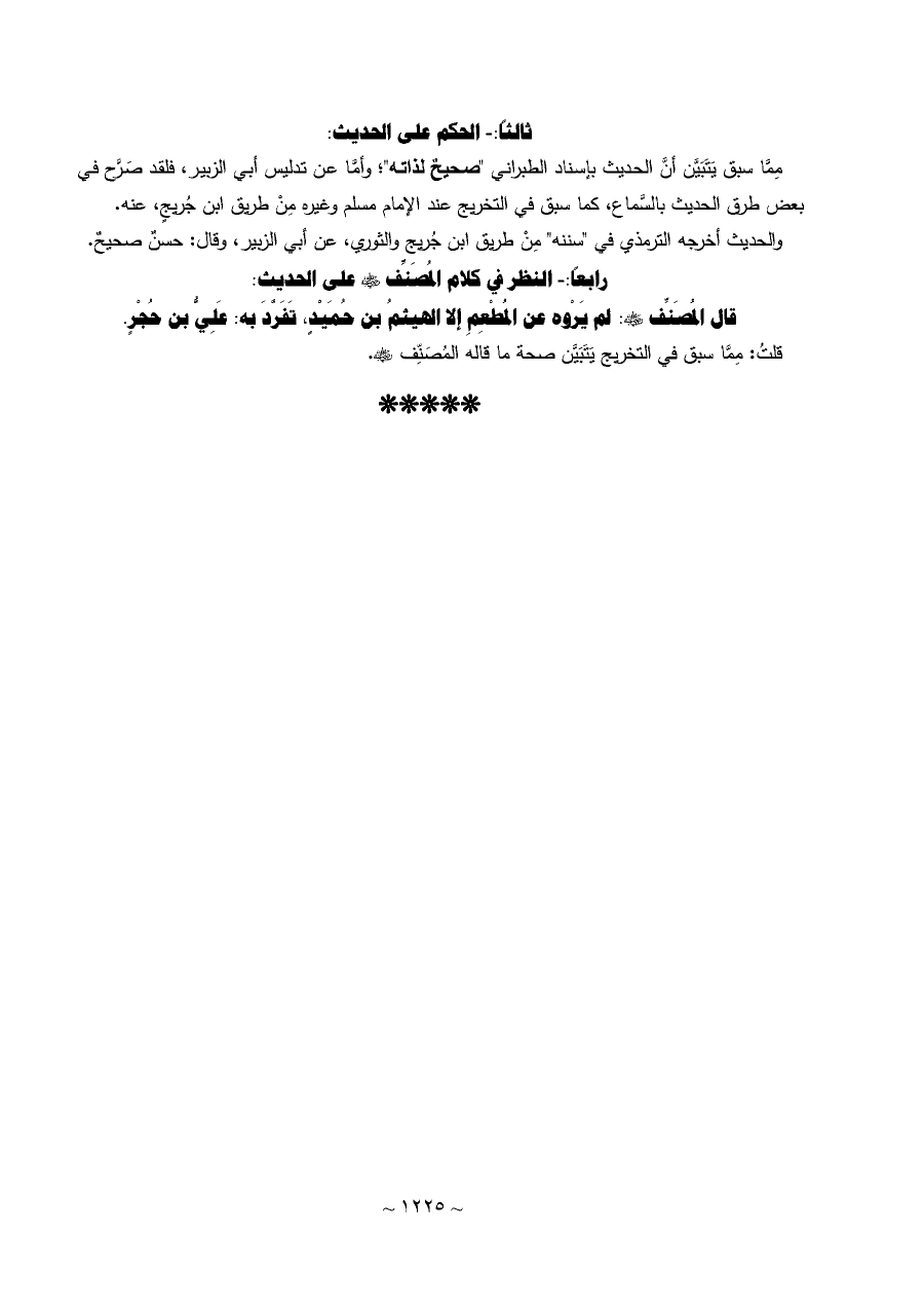 مِمَّا سبق يَتَبَيَّن أنَّ الحديث بإسناد الطبراني "صحيحٌ لذاته"؛ وأمَّا عن تدليس أبي الزبير، فلقد صَرَّح في بعض طرق الحديث بالسَّماع، كما سبق في التخريج عند الإمام مسلم وغيره مِنْ طريق ابن جُريجٍ، عنه.