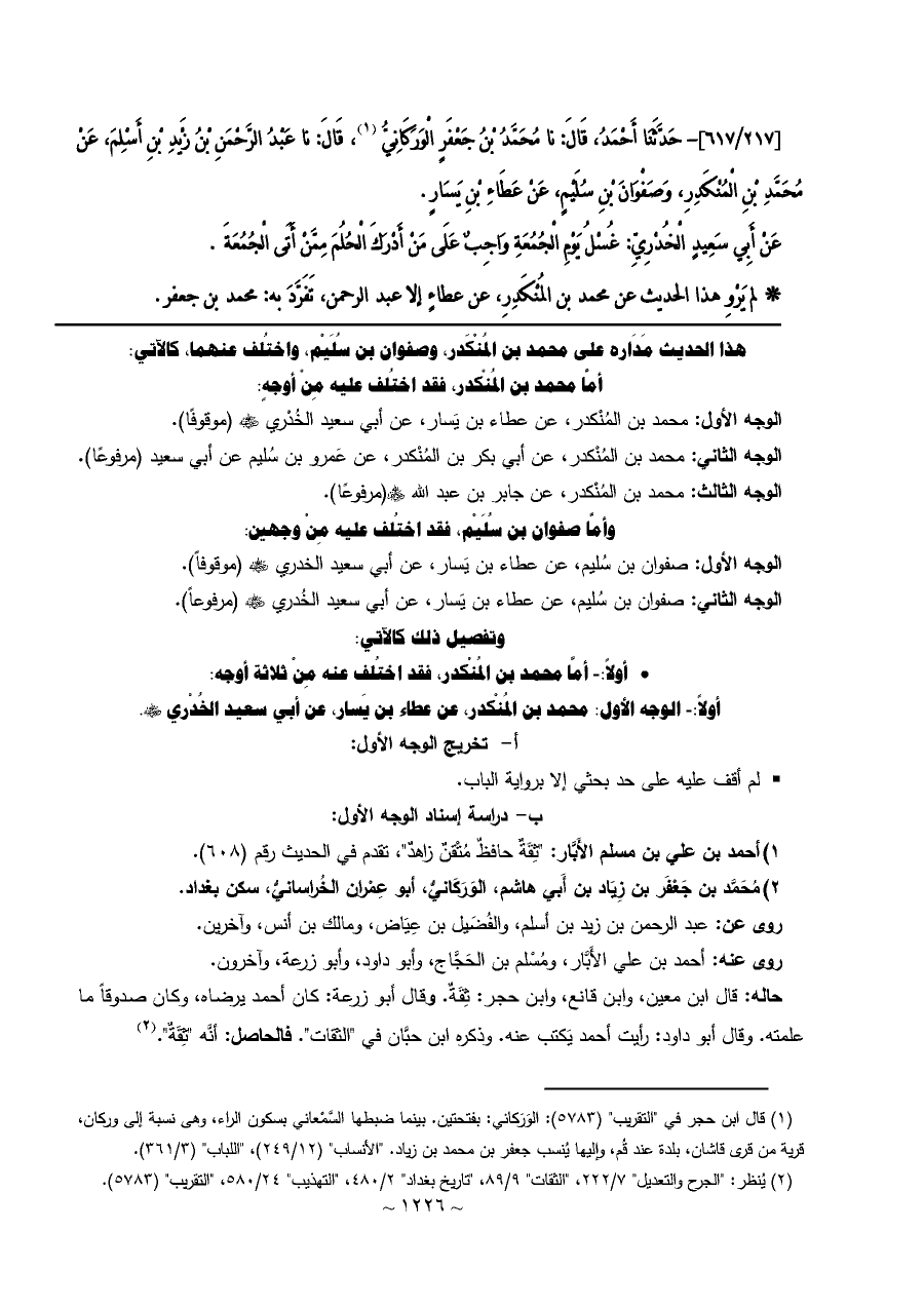 [٢١٧/ ٦١٧]- حَدَّثَنَا أَحْمَدُ، قَالَ: نا مُحَمَّدُ بْنُ جَعْفَرٍ الْوَرَكَانِيُّ (¬١)، قَالَ: نا عَبْدُ الرَّحْمَنِ بْنُ زَيْدِ بْنِ أَسْلِمَ، عَنْ مُحَمَّدِ بْنِ الْمُنْكَدِرِ، وَصَفْوَانَ بْنِ سُلَيْمٍ، عَنْ عَطَاءِ بْنِ يَسَارٍ.