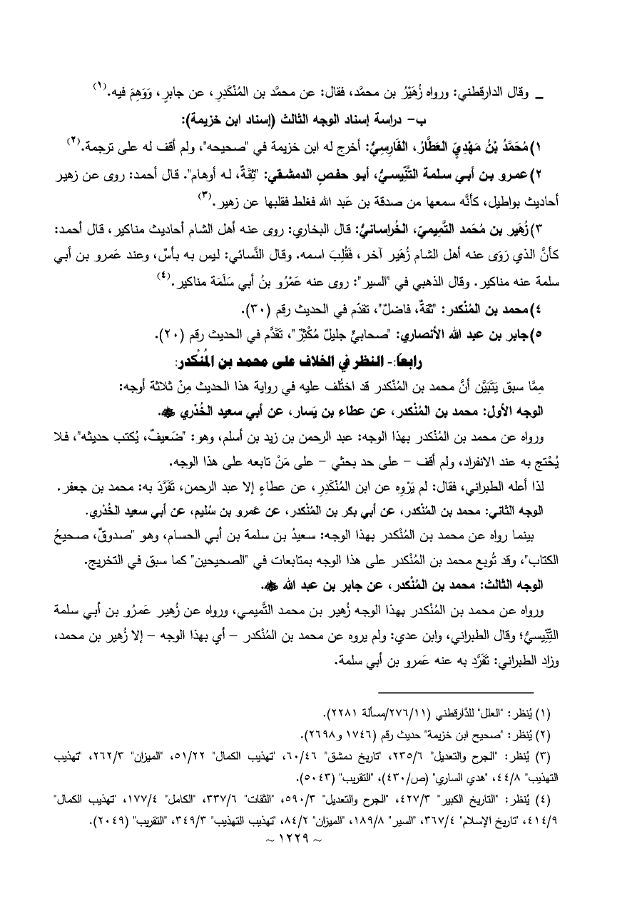 - وقال الدارقطني: ورواه زُهَيْرُ بن محمَّد، فقال: عن محمَّد بن المُنْكَدِرِ، عن جابرٍ، وَوَهِمَ فيه. (¬١)