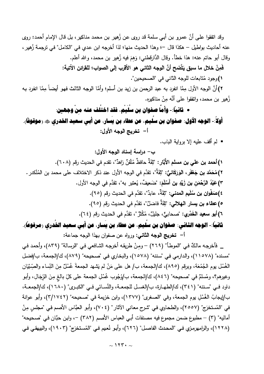 ٢) أنَّ الوجه الأول مِمَّا انفرد به عبد الرحمن بن زيد بن أسلم؛ وأمَّا الوجه الثالث فهو أيضاً مِمَّا انفرد به زُهير بن محمد، واتفقوا على أنَّه مِنْ مناكيره.