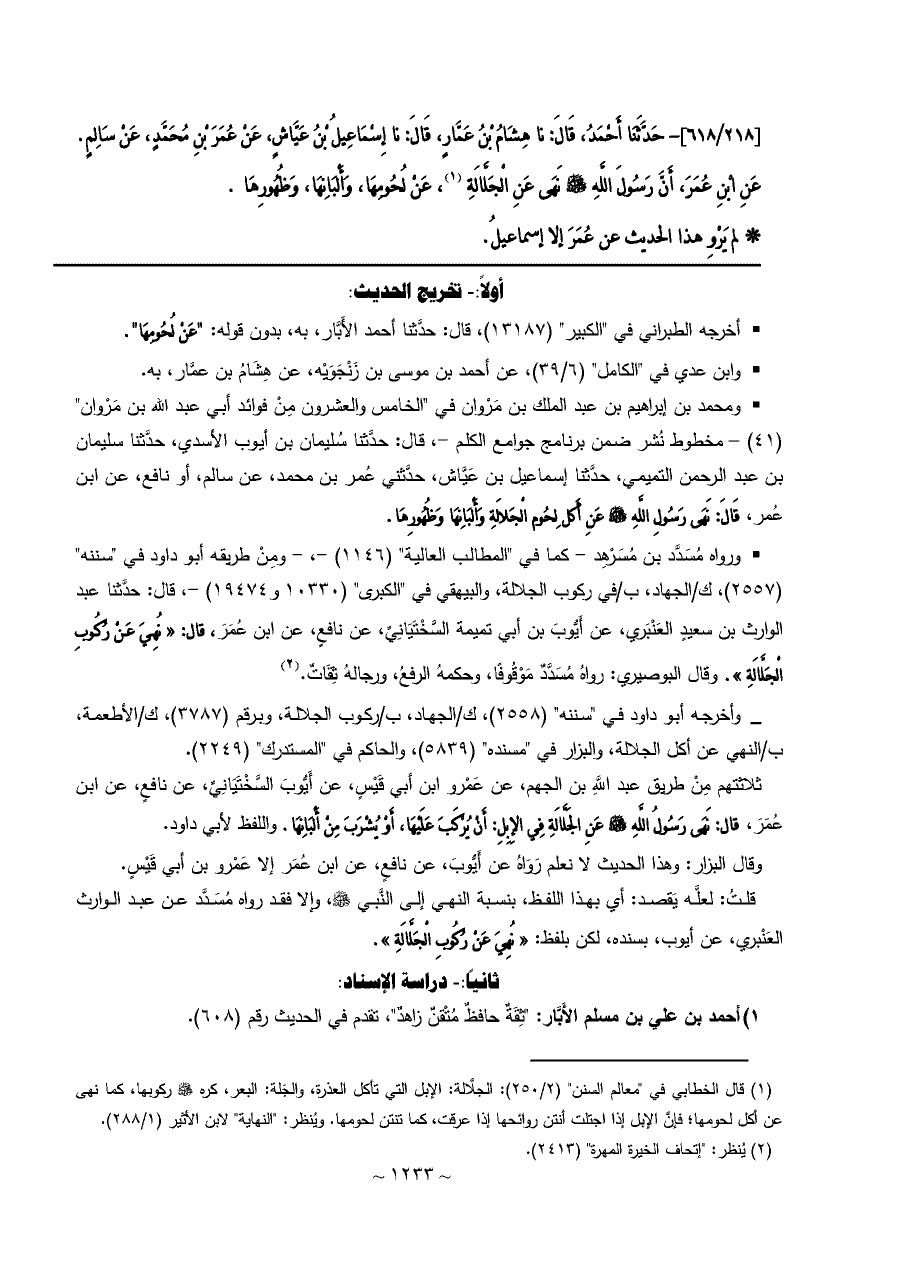 • ورواه مُسَدَّد بن مُسَرْهِد - كما في "المطالب العالية" (١١٤٦) -، - ومِنْ طريقه أبو داود في "سننه" (٢٥٥٧)، ك/الجهاد، ب/في ركوب الجلالة، والبيهقي في "الكبرى" (١٠٣٣٠ و ١٩٤٧٤) -، قال: حدَّثنا عبد الوارث بن سعيدٍ العَنْبَري، عن أَيُّوبَ بن أبي تميمة السَّخْتَيَانِيِّ، عن نافعٍ، عن ابن عُمَرَ، قال: «نُهِيَ عَنْ رُكُوبِ الْجَلَّالَةِ». وقال البوصيري: رواهُ مُسَدَّدٌ مَوْقُوفًا، وحكمهُ الرفعُ، ورجالهُ ثِقَاتٌ. (¬٢)