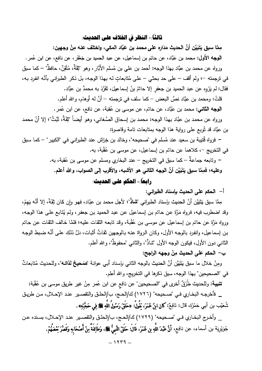 مِمَّا سبق يَتَبَيَّن أنَّ الحديث بإسناد الطبراني "شاذٌ"؛ لأجل محمد بن عبَّاد، فهو وإن كان ثِقَةً، إلا أنَّه يَهِمُ، وقد اضطرب فيه، فرواه مَرَّة عن حاتم بن إسماعيل عن عبد الحميد بن جعفر، ولم يُتابع على هذا الوجه، ورواه مَرَّة عن حاتم بن إسماعيل عن موسى بن عُقْبة، وقد تابعه الثقات عليه؛ فلمَّا خالف الثقات عن حاتم بن إسماعيل، وانفرد بالوجه الأول، وكان الرواة عنه بالوجهين ثقاتٌ أثبات، دلَّ ذلك على أنَّه ضبط الوجه الثاني دون الأول، فيكون الوجه الأول "شاذٌ"، والثاني "محفوظٌ"، والله أعلم.