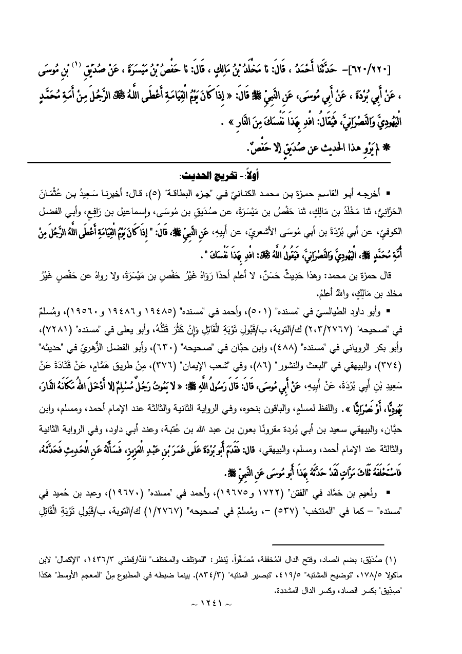 • أخرجه أبو القاسم حمزة بن محمد الكنانيّ في "جزء البطاقة" (٥)، قال: أخبرنا سَعِيدُ بن عُثْمَانَ الحَرَّانِيُّ، ثنا مَخْلَدُ بن مَالِكٍ، ثنا حَفْصُ بن مَيْسَرَةَ، عن صُدَيقِ بن مُوسَى، وإسماعيل بن رَافِعٍ، وأبي الفضل الكوفيِّ، عن أبي بُرْدَةَ بن أبي مُوسَى الأشعريِّ، عن أَبِيهِ، عَنِ النَّبِيِّ - صلى الله عليه وسلم -، قَالَ: " إِذَا كَانَ يَوْمُ الْقِيَامَةِ أَعْطَى اللَّهُ الرَّجُلَ مِنْ أُمَّةِ مُحَمَّدٍ - صلى الله عليه وسلم -، الْيَهُودِيَّ وَالنَّصْرَانِيَّ، فَيَقُولُ اللَّهُ - عز وجل -: افْدِ بِهَذَا نَفْسَكَ ".