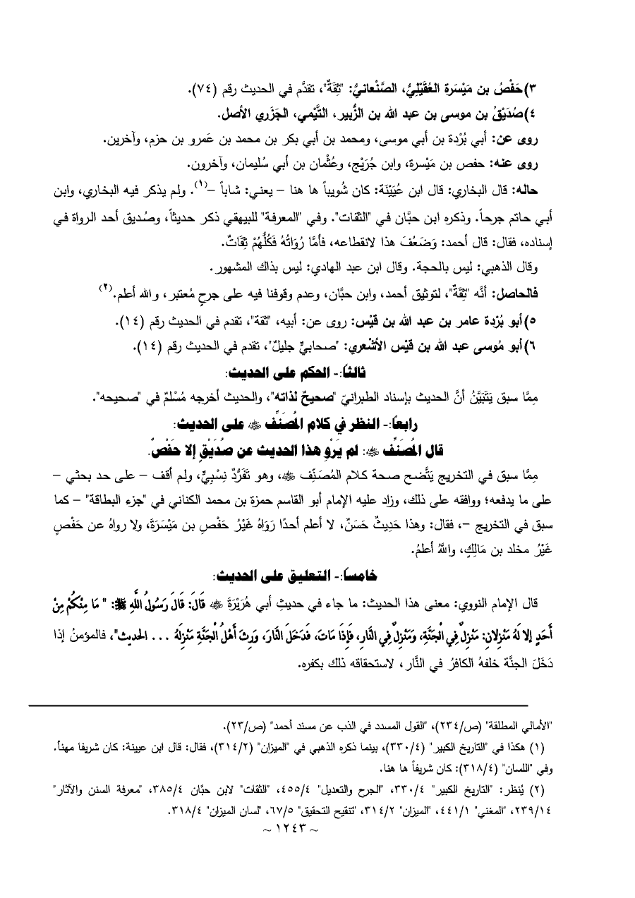 مِمَّا سبق في التخريج يَتَّضح صحة كلام المُصَنِّف - رضي الله عنه -، وهو تَفَرُّدٌ نِسْبِيٌّ، ولم أقف - على حد بحثي - على ما يدفعه؛ ووافقه على ذلك، وزاد عليه الإمام أبو القاسم حمزة بن محمد الكناني في "جزء البطاقة" - كما سبق في التخريج -، فقال: وهذا حَدِيثٌ حَسَنٌ، لا أعلم أحدًا رَوَاهُ غَيْرُ حَفْصِ بن مَيْسَرَةَ، ولا رواهُ عن حَفْصٍ غَيْرُ مخلد بن مَالِكٍ، واللَّهُ أعلمُ.